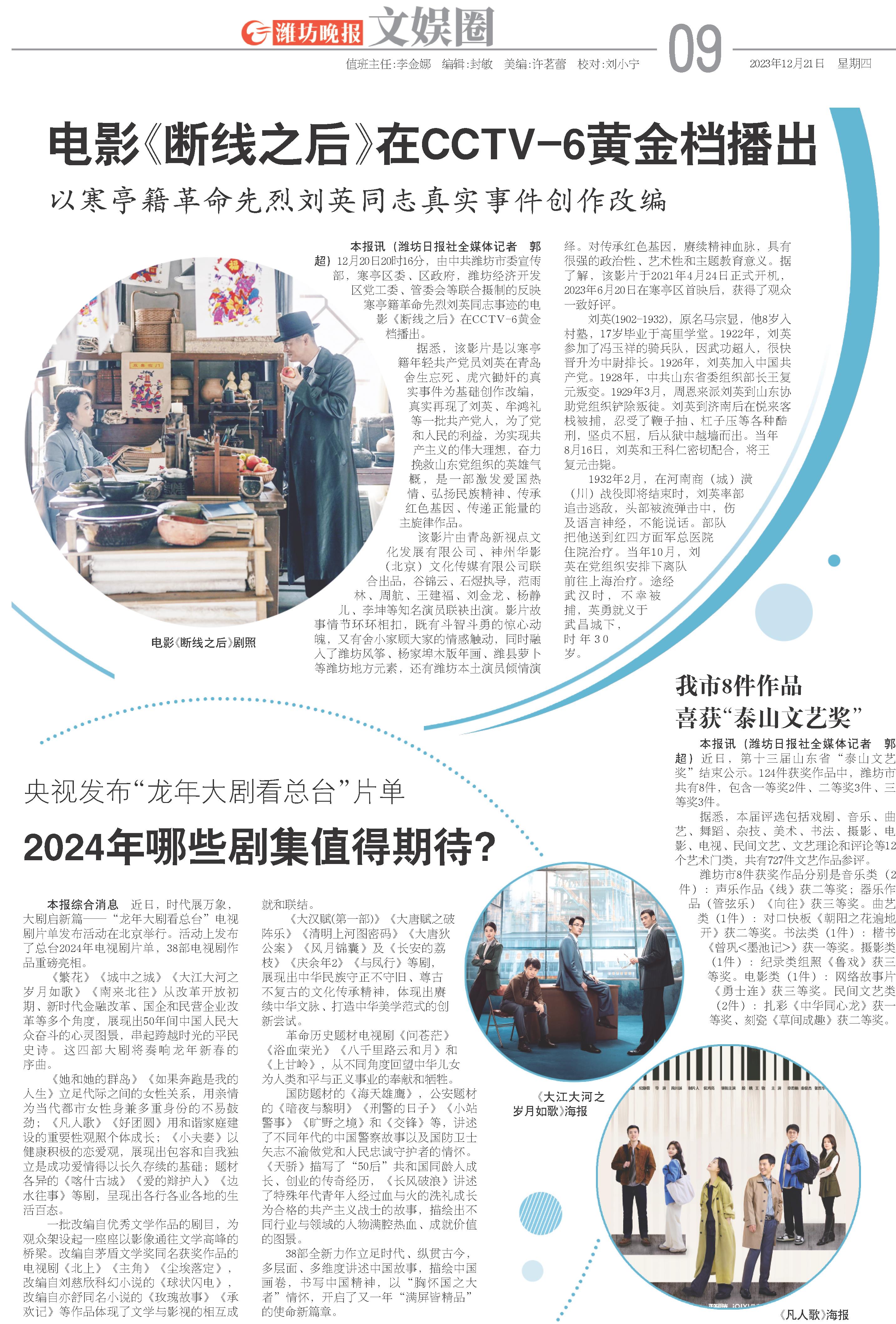 本报讯(潍坊日报社全媒体记者 郭超)近日,第十三届山东省“泰山文艺奖”结束公示。124件获奖作品中,潍坊市共有8件,包含一等奖2件、二等奖3件、三等奖3件。