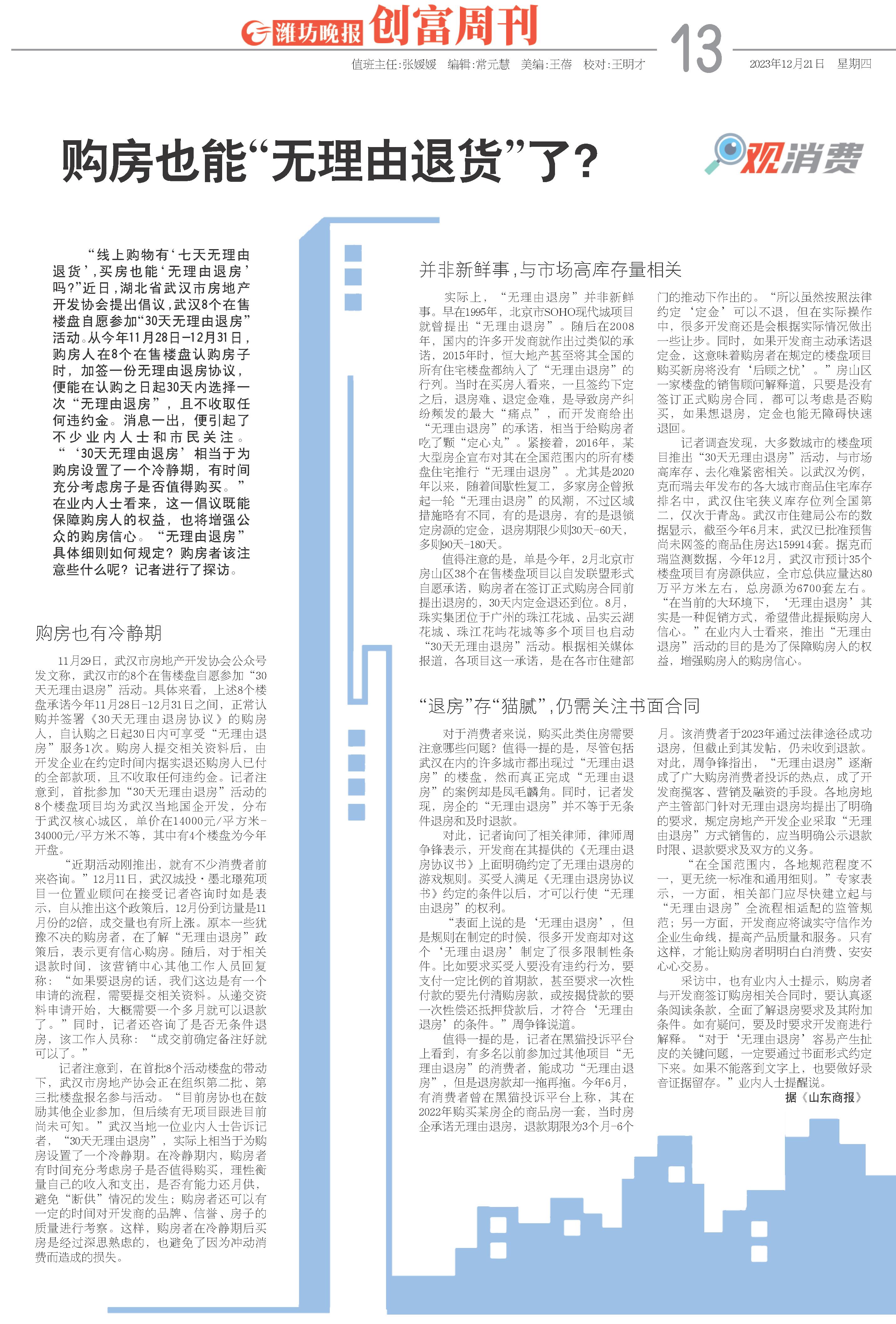 “线上购物有‘七天无理由退货’,买房也能‘无理由退房’吗?”近日,湖北省武汉市房地产开发协会提出倡议,武汉8个在售楼盘自愿参加“30天无理由退房”活动。从今年11月28日-12月31日,购房人在8个在售楼盘认购房子时,加签一份无理由退房协议,便能在认购之日起30天内选择一次“无理由退房”,且不收取任何违约金。消息一出,便引起了不少业内人士和市民关注。“‘30天无理由退房’相当于为购房设置了一个冷静期,有时间充分考虑房子是否值得购买。”在业内人士看来,这一倡议既能保障购房人的权益,也将增强公众的购房信心。“无理由退房”具体细则如何规定?购房者该注意些什么呢?记者进行了探访。