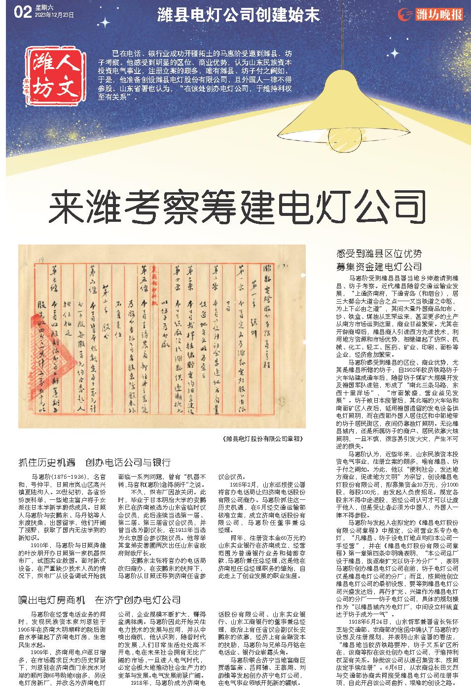已在电话、银行业成功开疆拓土的马惠阶受邀到潍县、坊子考察。他感受到明显的区位、商业优势,认为山东民族资本投资电气事业,注册立案的颇多,唯有潍县、坊子付之阙如。于是,他准备创设潍县电灯股份有限公司,且外国人一律不得参股。山东省署也认为,“在该处创办电灯公司,于维持利权至有关系”。