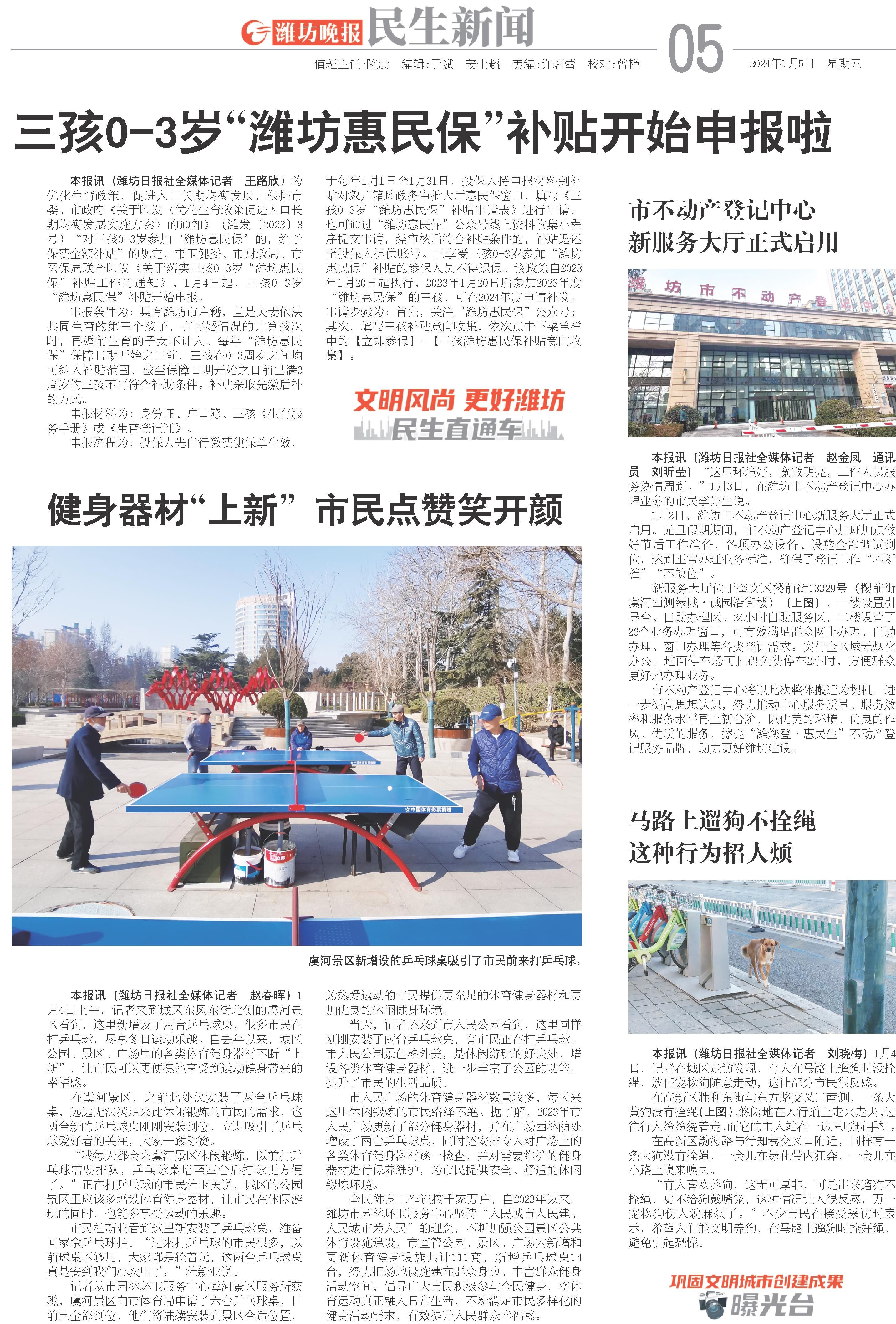 本报讯(潍坊日报社全媒体记者 王路欣)为优化生育政策,促进人口长期均衡发展,根据市委、市政府《关于印发〈优化生育政策促进人口长期均衡发展实施方案〉的通知》(潍发〔2023〕3号)“对三孩0-3岁参加‘潍坊惠民保’的,给予保费全额补贴”的规定,市卫健委、市财政局、市医保局联合印发《关于落实三孩0-3岁“潍坊惠民保”补贴工作的通知》,1月4日起,三孩0-3岁“潍坊惠民保”补贴开始申报。