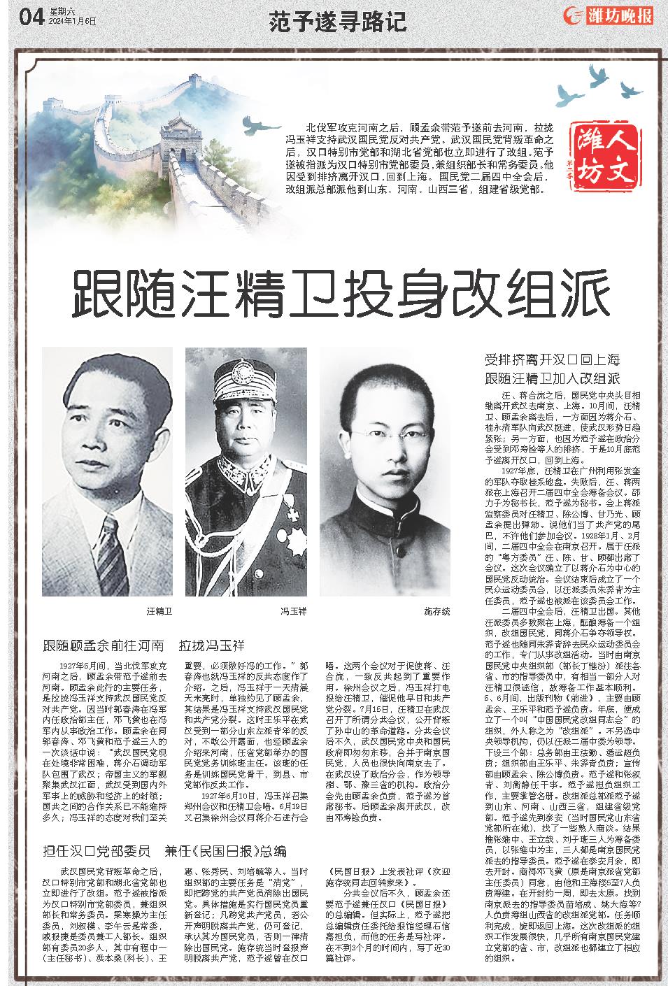 二届四中全会后,汪精卫出国。其他汪派委员多数聚在上海,酝酿筹备一个组织,改组国民党,同蒋介石争夺领导权。范予遂也随同朱霁青辞去民众运动委员会的工作,专门从事改组活动。当时由南京国民党中央组织部(部长丁惟汾)派往各省、市的指导委员中,有相当一部分人对汪精卫很迷信,故筹备工作基本顺利。5、6月间,出版刊物《前进》,主要由顾孟余、王乐平和范予遂负责。年底,便成立了一个叫“中国国民党改组同志会”的组织,外人称之为“改组派”。不另选中央领导机构,仍以汪派二届中委为领导。下设三个部:总务部由王法勤、潘运超负责;组织部由王乐平、朱霁青负责;宣传部由顾孟余、陈公博负责。范予遂和张叙青、刘衡静任干事。范予遂担负组织工作,主要掌管名册。改组派总部派范予遂到山东、河南、山西三省,组建省级党部。范予遂先到泰安(当时国民党山东省党部所在地),找了一些熟人商谈。结果推张维中、王立哉、刘子班三人为筹备委员,以张维中为主,三人都是南京国民党派去的指导委员。范予遂在泰安月余,即去开封。商得邓飞黄(原是南京派省党部主任委员)同意,由他和王海楼5至7人负责筹建。在开封约一周,即去太原。找到南京派去的指导委员苗培成、姚大海等7人负责筹组山西省的改组派党部。任务顺利完成,旋即返回上海。这次改组派的组织工作发展很快,几乎所有南京国民党建立党部的省、市,改组派也都建立了相应的组织。