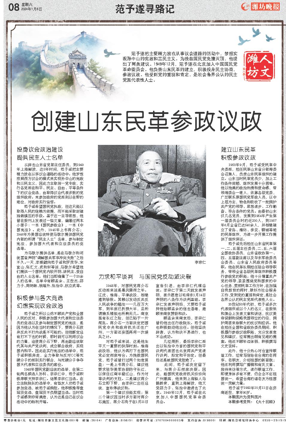 范予遂把主要精力放在从事议会道路的活动中,梦想实现孙中山的宪政和三民主义。为挽救国民党免遭灭顶,他提出了两条建议。1949年12月,范予遂在北京加入中国国民党革命委员会。他负责山东民革的建立,积极投身民主协商,参政议政。他受到党的重视和肯定,是社会各界公认的民主党派代表性人士。
