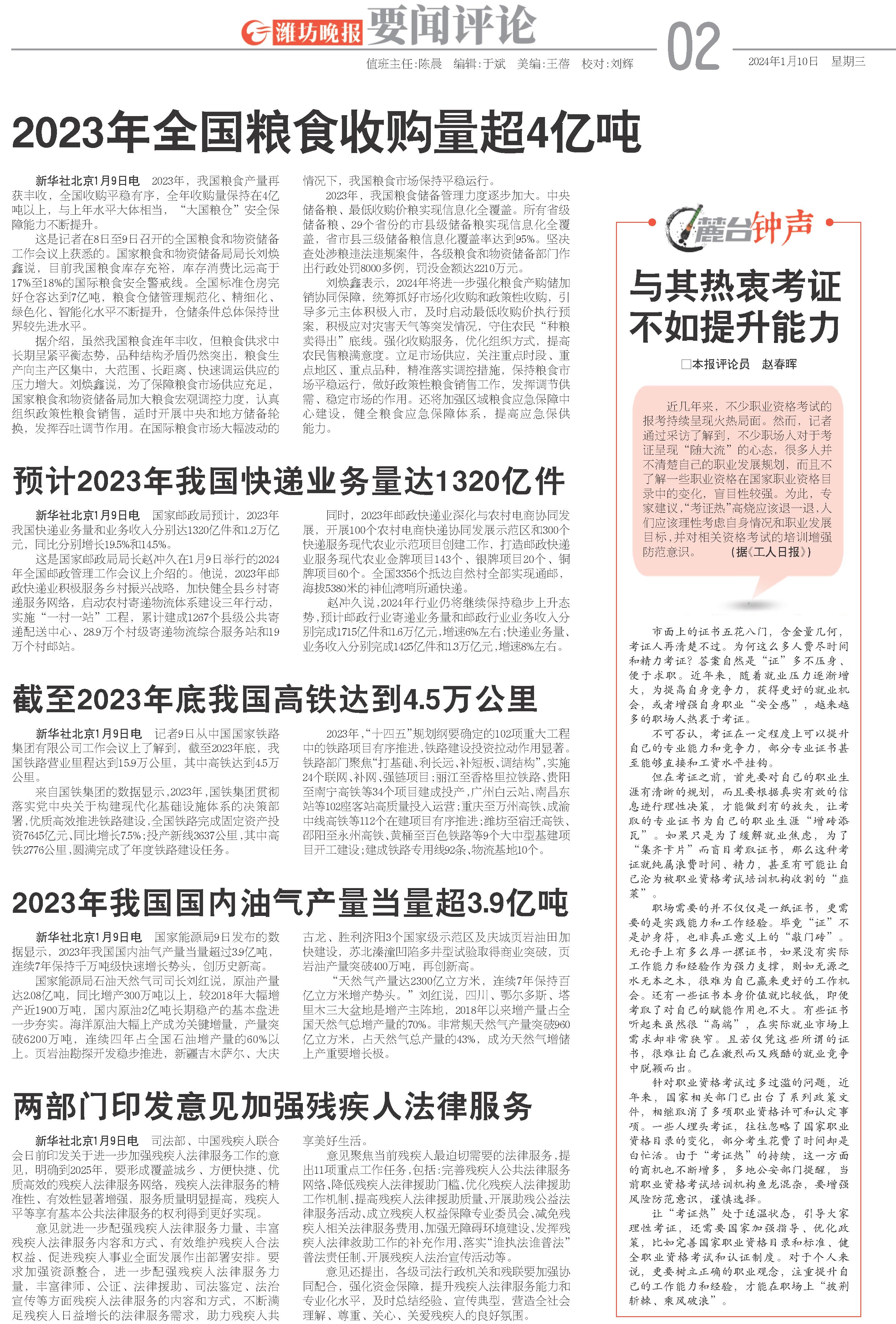 新华社北京1月9日电 2023年,我国粮食产量再获丰收,全国收购平稳有序,全年收购量保持在4亿吨以上,与上年水平大体相当,“大国粮仓”安全保障能力不断提升。