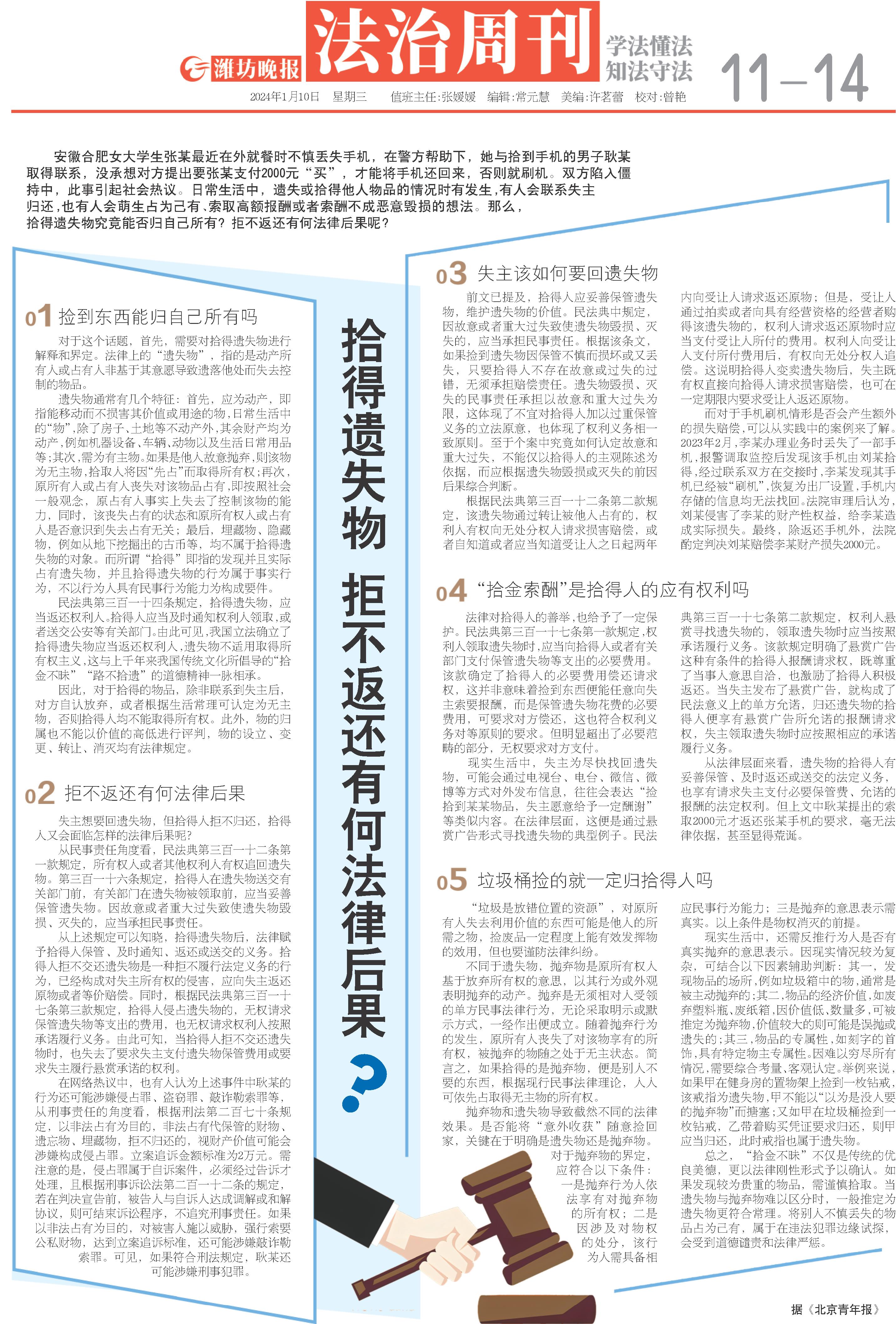 总之,“拾金不昧”不仅是传统的优良美德,更以法律刚性形式予以确认。如果发现较为贵重的物品,需谨慎拾取。当遗失物与抛弃物难以区分时,一般推定为遗失物更符合常理。将别人不慎丢失的物品占为己有,属于在违法犯罪边缘试探,会受到道德谴责和法律严惩。