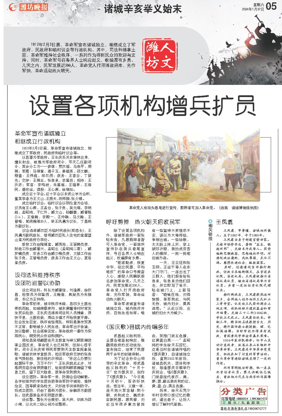 除了设置各项机构外,诸城军政府一面张贴布告,凡愿剪辫者皆可入革命党,一面组织宣传队在街头巷尾宣传,号召各界人士响应起义,收编原有乡勇。