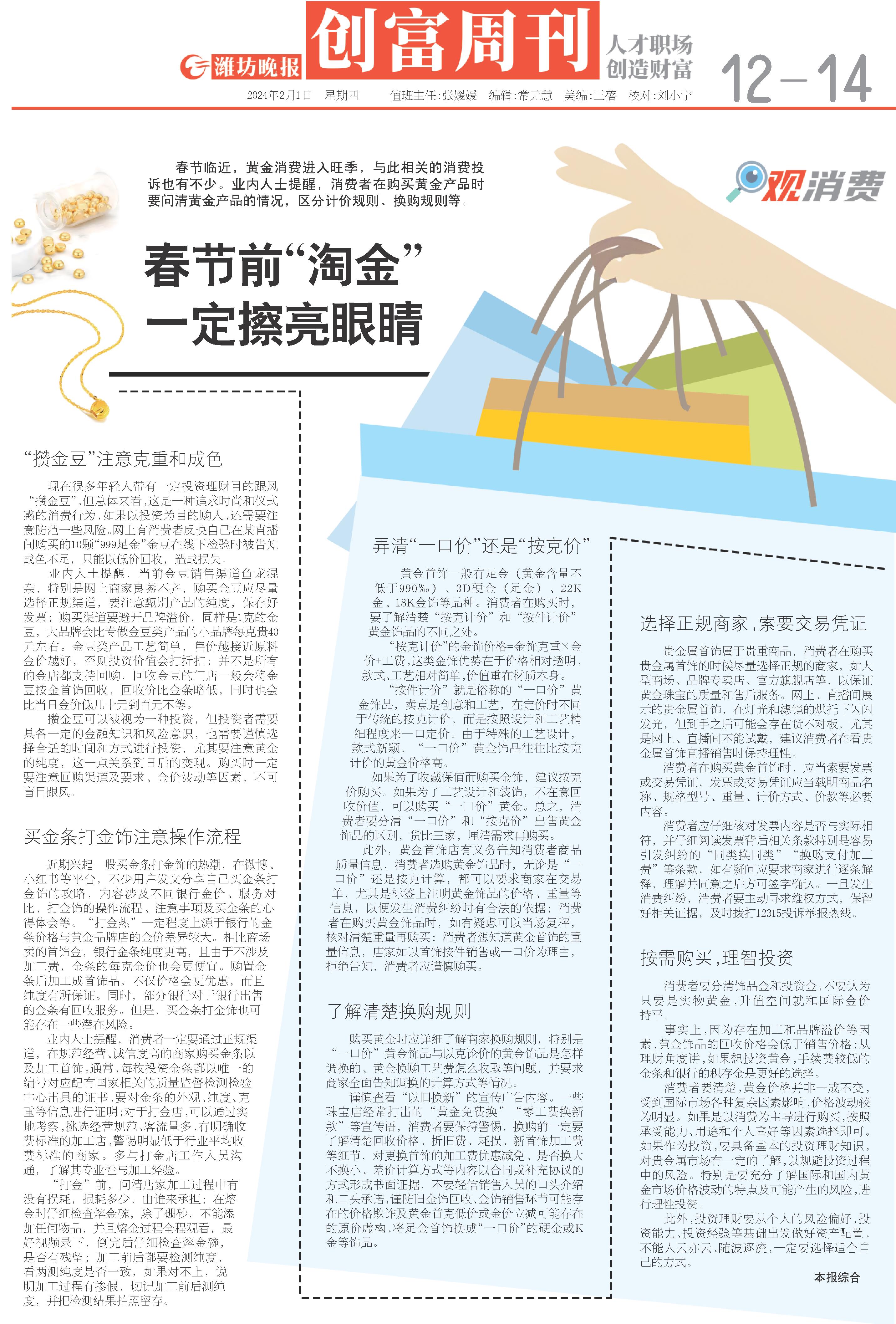 春节临近,黄金消费进入旺季,与此相关的消费投诉也有不少。业内人士提醒,消费者在购买黄金产品时要问清黄金产品的情况,区分计价规则、换购规则等。