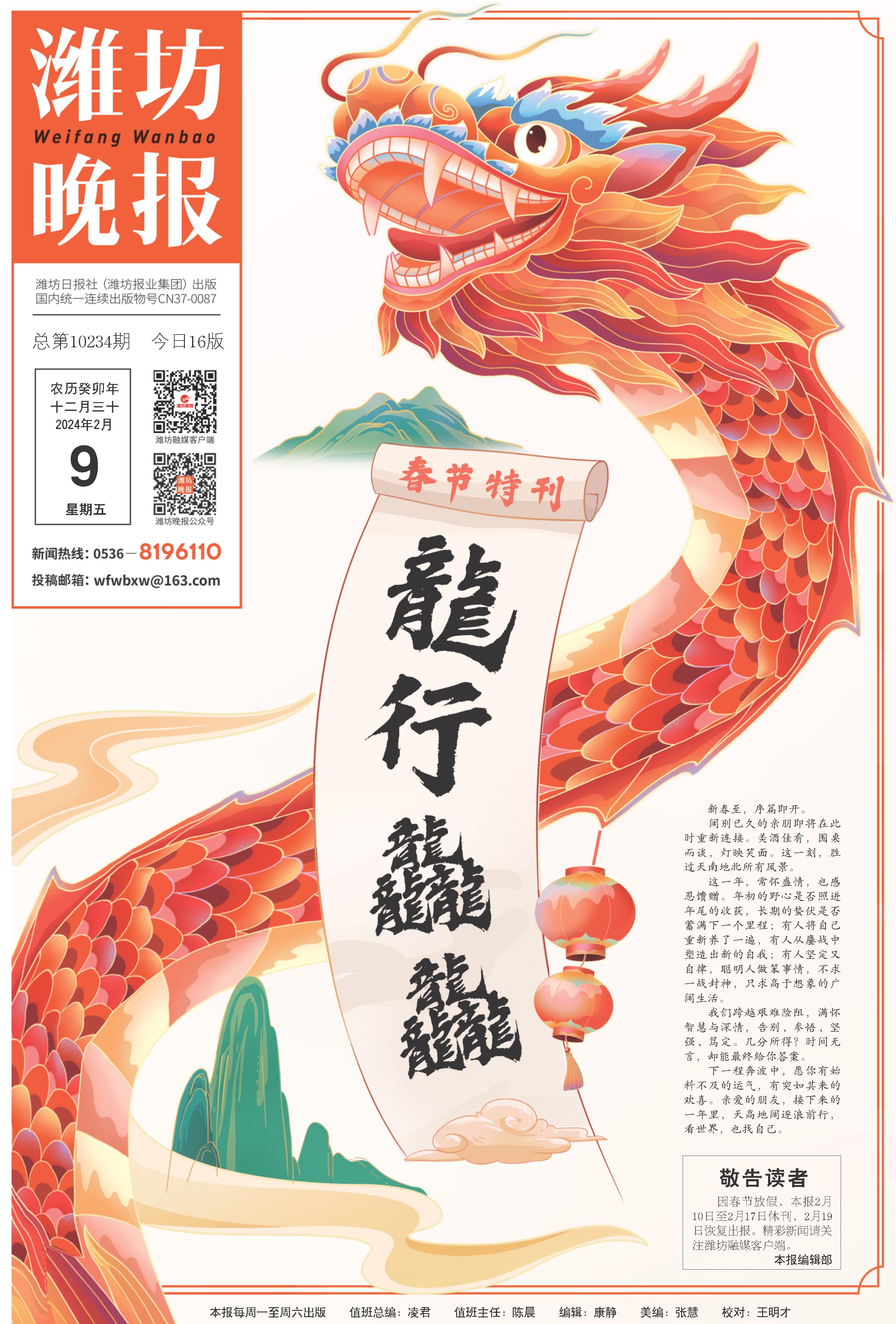 因春节放假,本报2月10日至2月17日休刊,2月19日恢复出报。精彩新闻请关注潍坊融媒客户端。