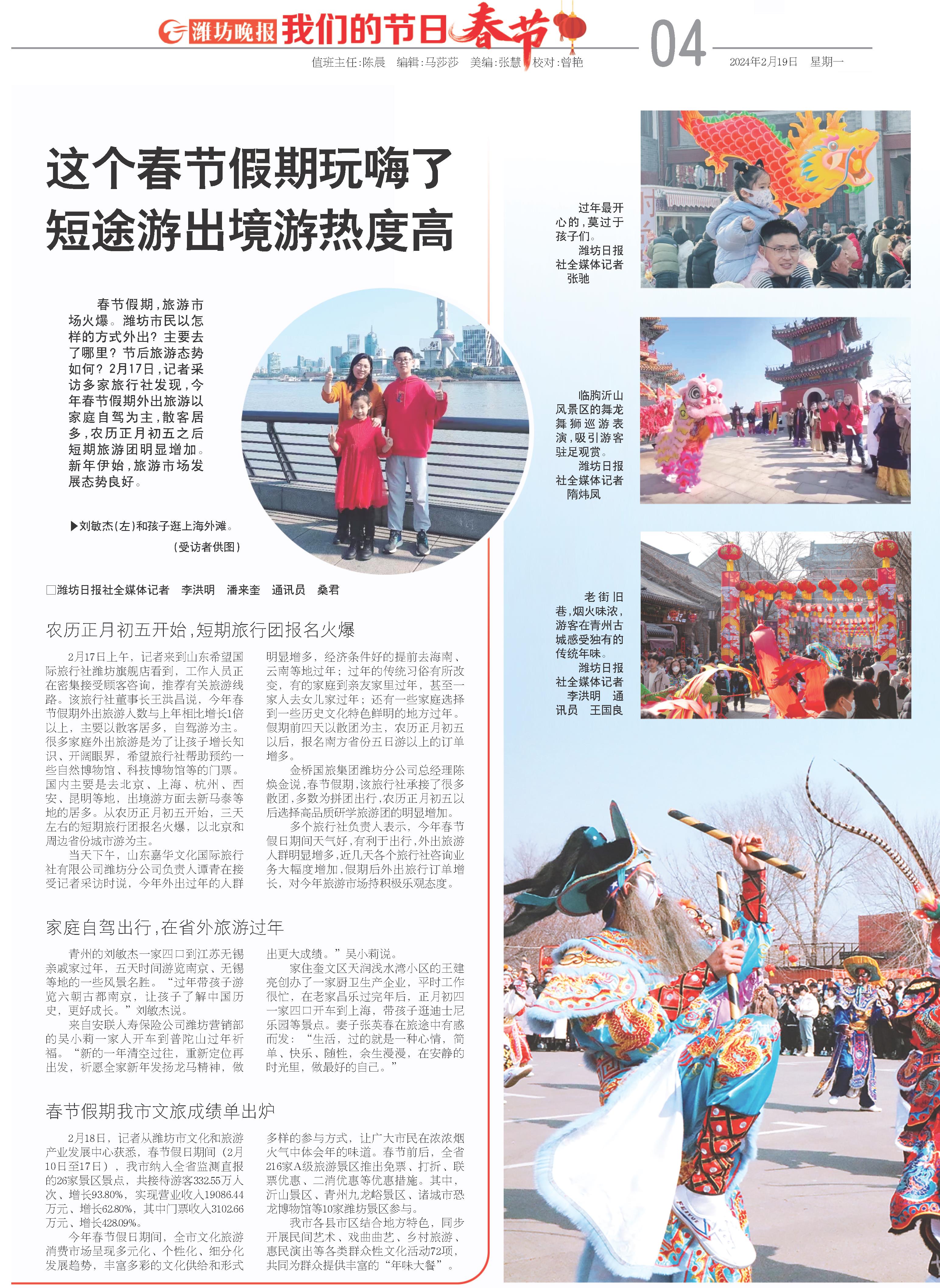 春节假期,旅游市场火爆。潍坊市民以怎样的方式外出?主要去了哪里?节后旅游态势如何?2月17日,记者采访多家旅行社发现,今年春节假期外出旅游以家庭自驾为主,散客居多,农历正月初五之后短期旅游团明显增加。新年伊始,旅游市场发展态势良好。