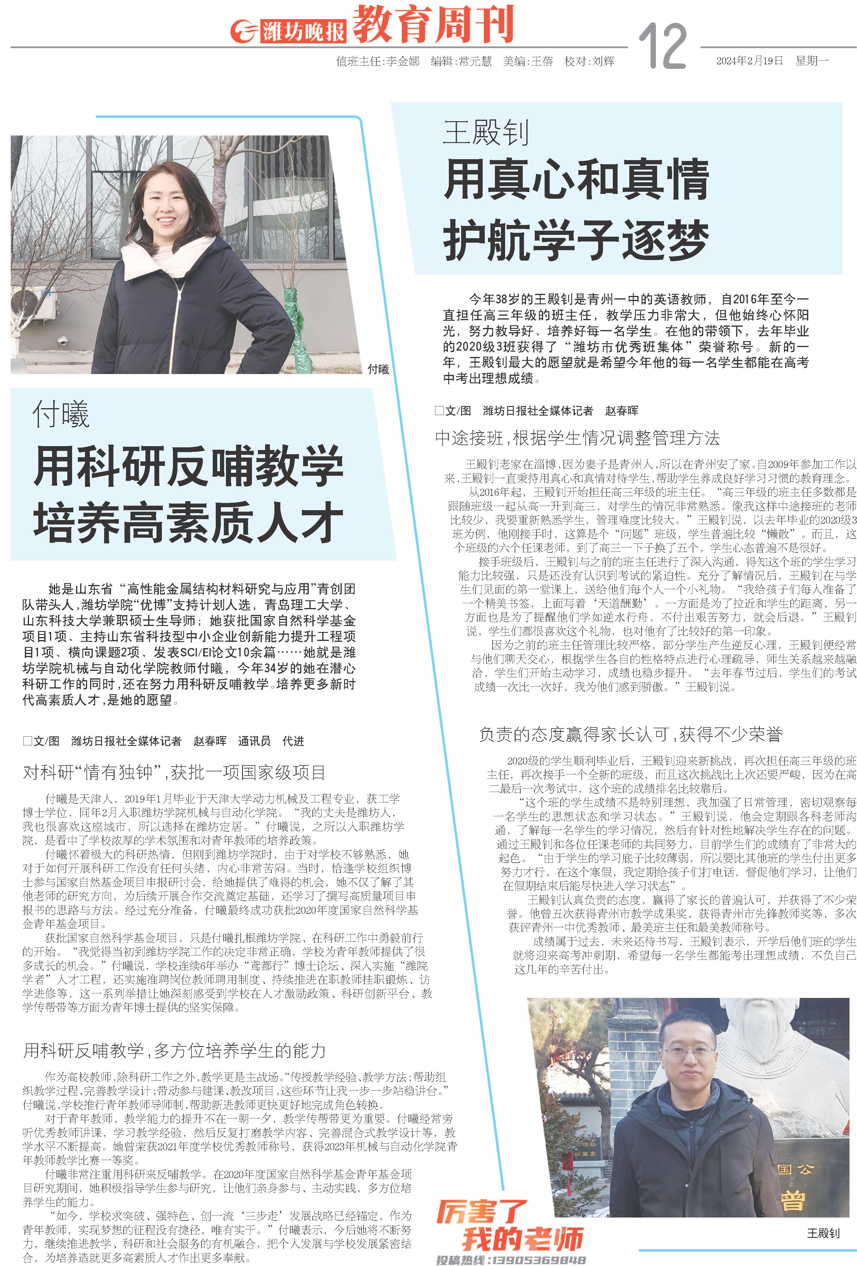 她是山东省“高性能金属结构材料研究与应用”青创团队带头人,潍坊学院“优博”支持计划人选,青岛理工大学、山东科技大学兼职硕士生导师;她获批国家自然科学基金项目1项、主持山东省科技型中小企业创新能力提升工程项目1项、横向课题2项、发表SCI/EI论文10余篇……她就是潍坊学院机械与自动化学院教师付曦,今年34岁的她在潜心科研工作的同时,还在努力用科研反哺教学。培养更多新时代高素质人才,是她的愿望。