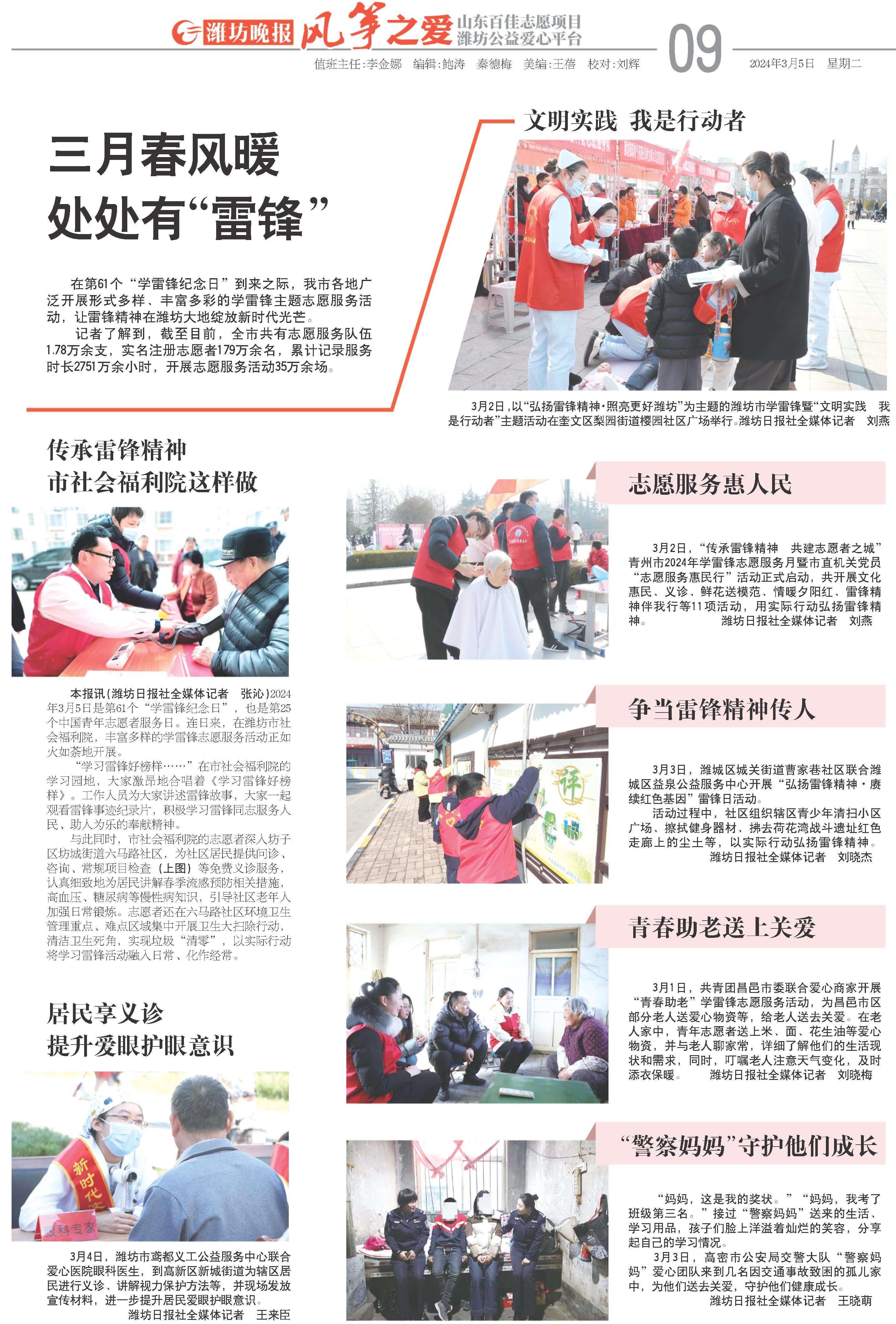 本报讯(潍坊日报社全媒体记者 张沁)2024年3月5日是第61个“学雷锋纪念日”,也是第25个中国青年志愿者服务日。连日来,在潍坊市社会福利院,丰富多样的学雷锋志愿服务活动正如火如荼地开展。