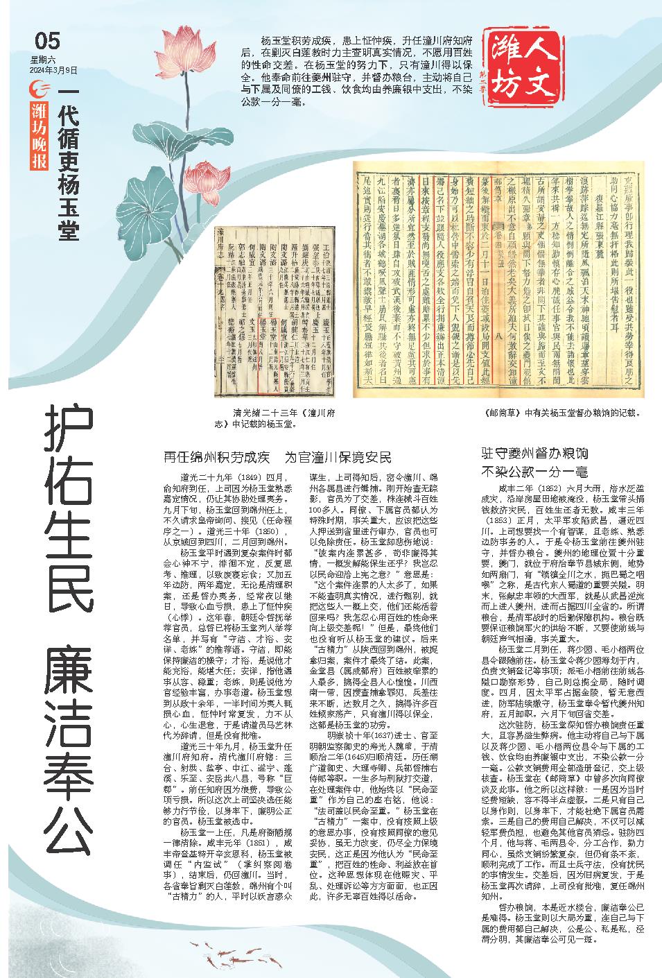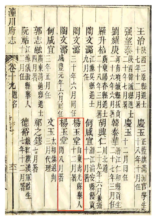 咸丰二年(1852)六月大雨,涪水泛滥成灾,沿岸房屋田地被淹没,杨玉堂带头捐钱救济灾民,百姓生还者无数。咸丰三年(1853)正月,太平军攻陷武昌,逼近四川。上司想要找一个有智谋,且老练、熟悉边防事务的人。于是令杨玉堂前往夔州驻守,并督办粮台。夔州的地理位置十分重要,夔门,就位于府治奉节县城东侧,地势如两扇门,有“锁镇全川之水,扼巴蜀之咽喉”之称,是古代东入蜀道的重要关隘。明末,张献忠率领的大西军,就是从武昌逆流而上进入夔州,进而占据四川全省的。所谓粮台,是清军战时的后勤保障机构。粮台既要保证粮饷军火的供给不断,又要使前线与朝廷声气相通,事关重大。