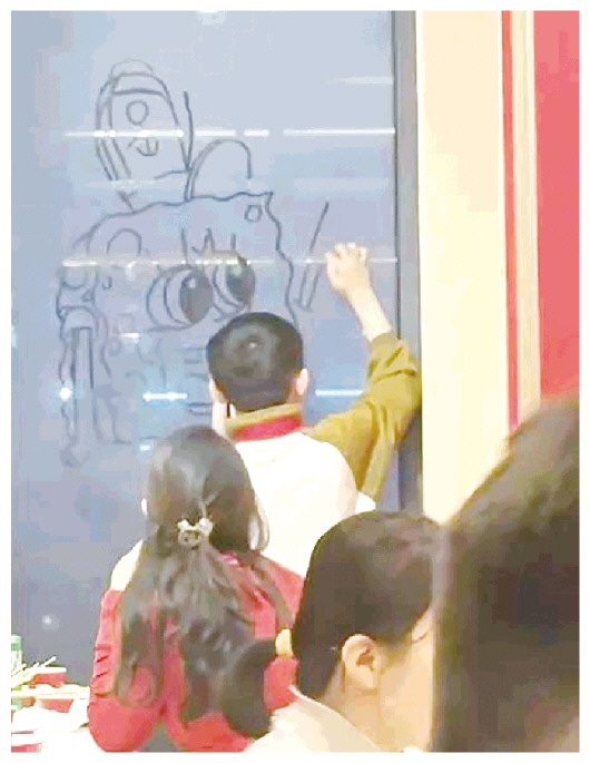 ▲刘嘉乐在有雾气的玻璃上作画。(视频截图)