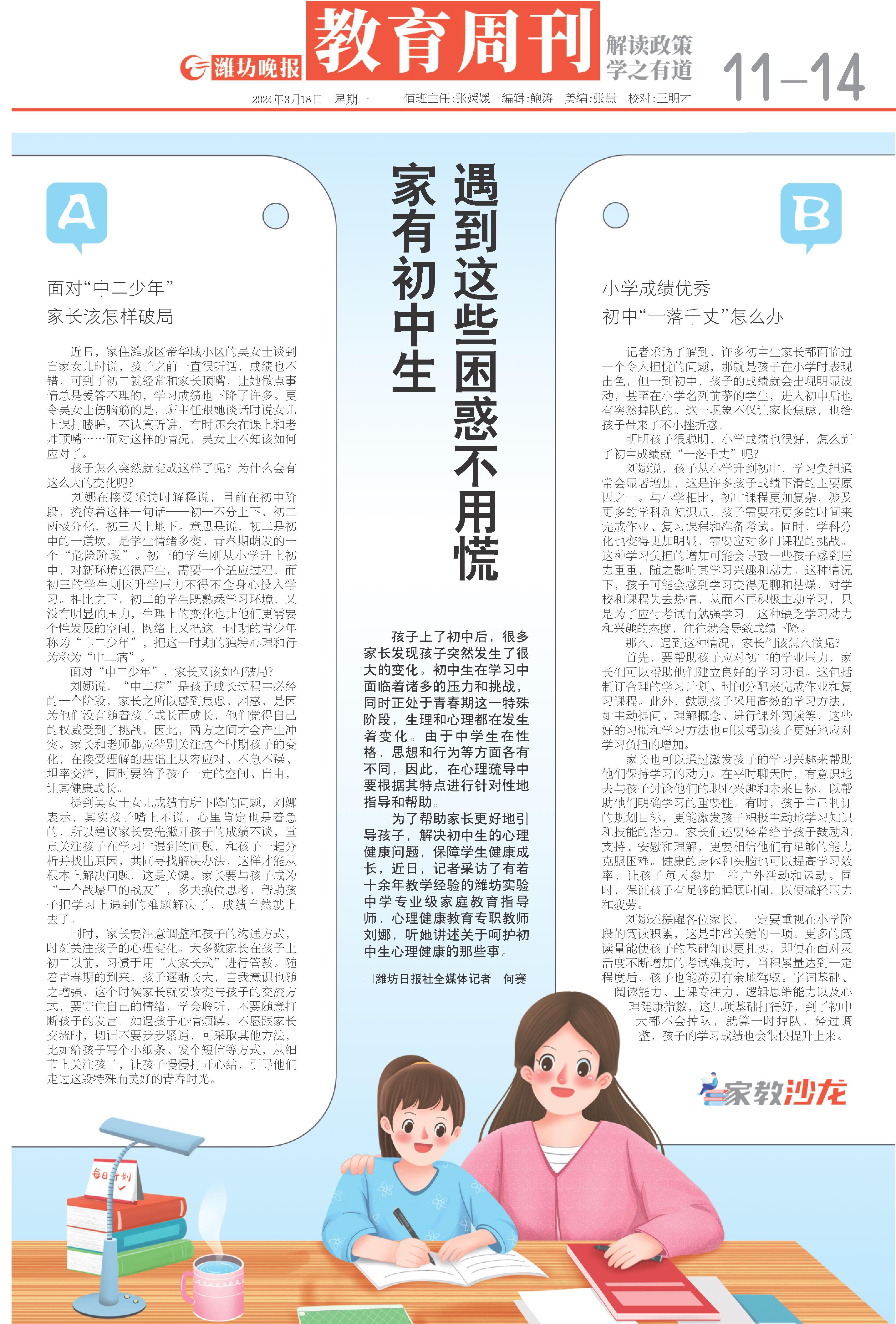 为了帮助家长更好地引导孩子,解决初中生的心理健康问题,保障学生健康成长,近日,记者采访了有着十余年教学经验的潍坊实验中学专业级家庭教育指导师、心理健康教育专职教师刘娜,听她讲述关于呵护初中生心理健康的那些事。