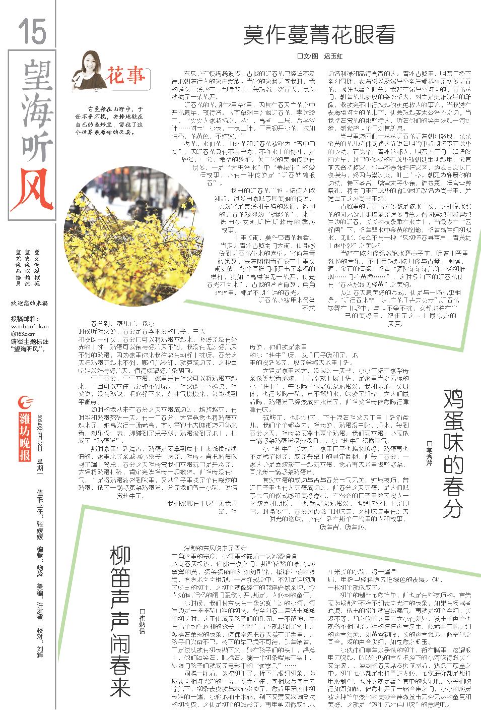 春分到,蛋儿俏。我小时候听祖父说,春分是春季平分的日子,白天和夜晚一样长,春分日可以将鸡蛋立起来,竖好了没有外界的干扰,鸡蛋可以保持好几天不倒。我没有见过好几天不倒的鸡蛋,因为家里你来我往总有动静干扰呀。春分这天把鸡蛋立起来不倒,哪怕几秒钟,就算成功了,这种喜悦足以维持好几天,值得炫耀好几条胡同。