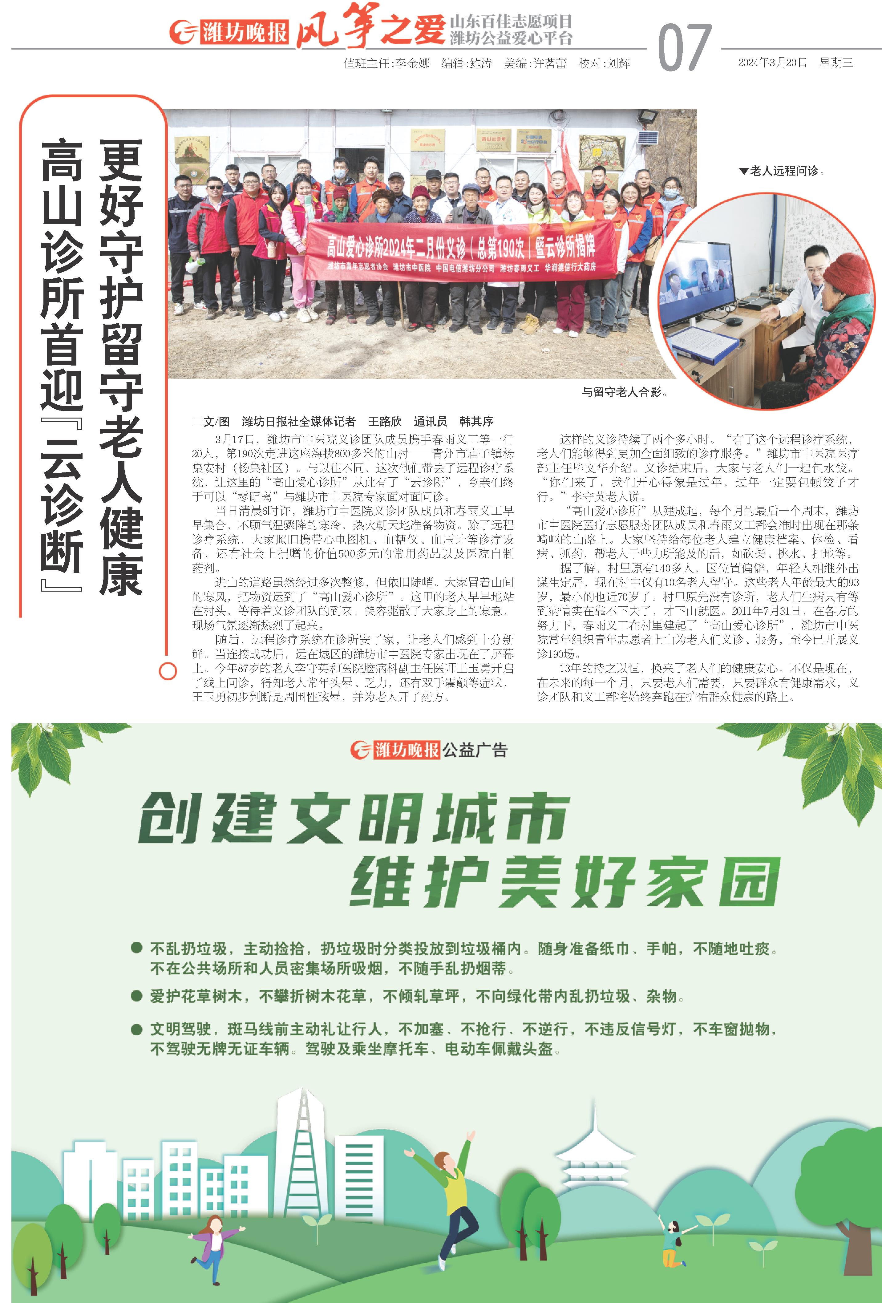 “高山爱心诊所”从建成起,每个月的最后一个周末,潍坊市中医院医疗志愿服务团队成员和春雨义工都会准时出现在那条崎岖的山路上。大家坚持给每位老人建立健康档案、体检、看病、抓药,帮老人干些力所能及的活,如砍柴、挑水、扫地等。