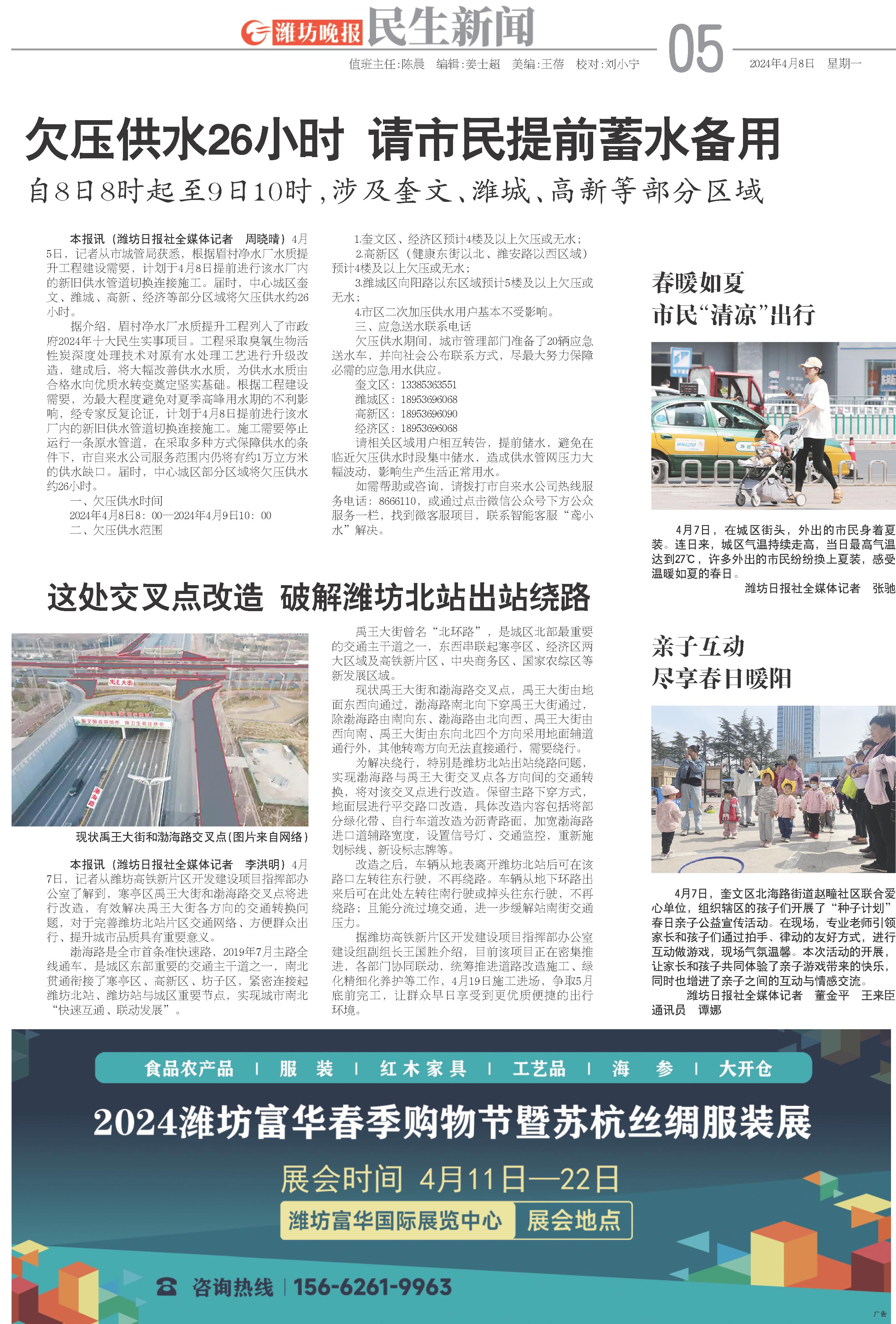 本报讯(潍坊日报社全媒体记者 周晓晴)4月5日,记者从市城管局获悉,根据眉村净水厂水质提升工程建设需要,计划于4月8日提前进行该水厂内的新旧供水管道切换连接施工。届时,中心城区奎文、潍城、高新、经济等部分区域将欠压供水约26小时。