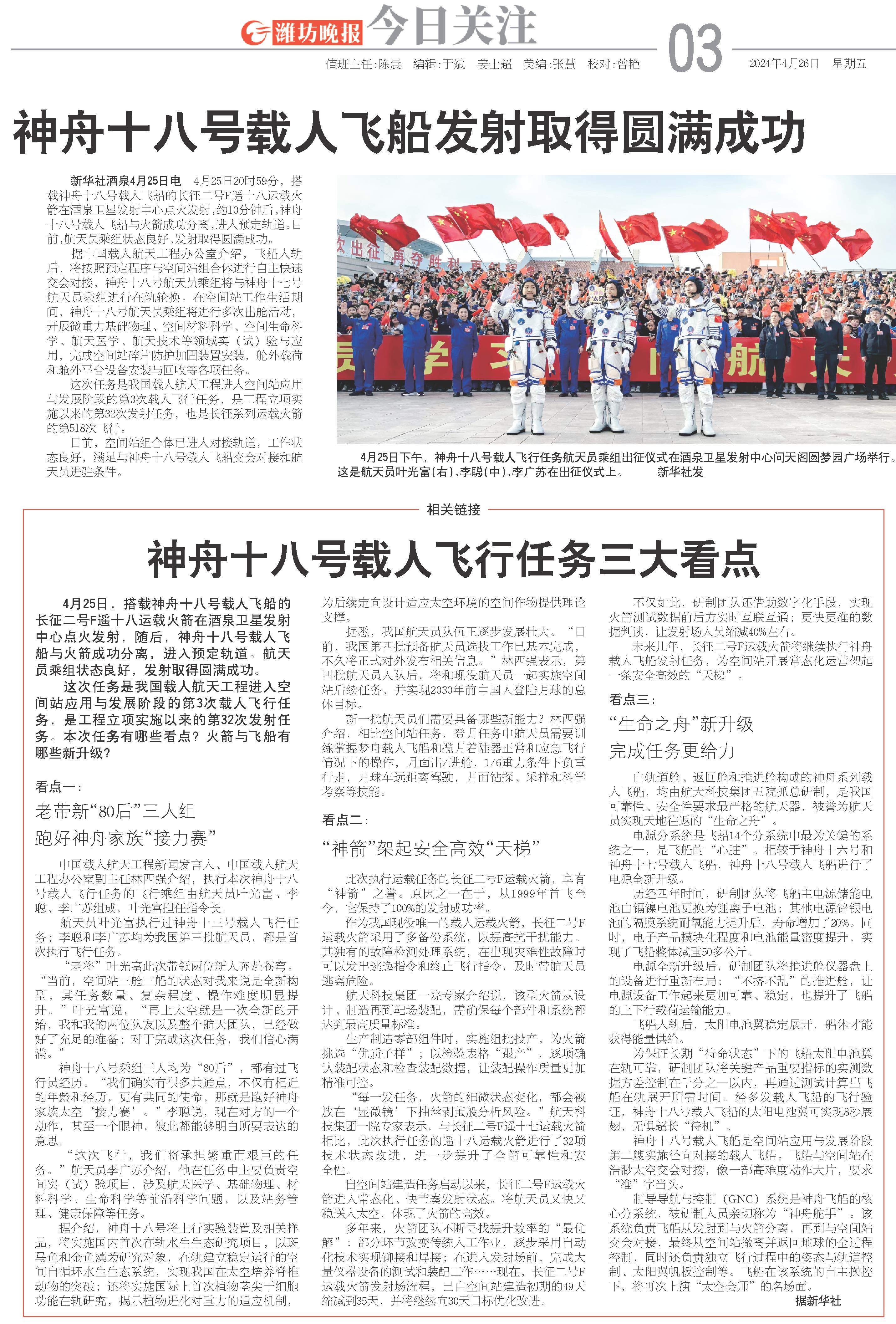 据中国载人航天工程办公室介绍,飞船入轨后,将按照预定程序与空间站组合体进行自主快速交会对接,神舟十八号航天员乘组将与神舟十七号航天员乘组进行在轨轮换。在空间站工作生活期间,神舟十八号航天员乘组将进行多次出舱活动,开展微重力基础物理、空间材料科学、空间生命科学、航天医学、航天技术等领域实(试)验与应用,完成空间站碎片防护加固装置安装,舱外载荷和舱外平台设备安装与回收等各项任务。