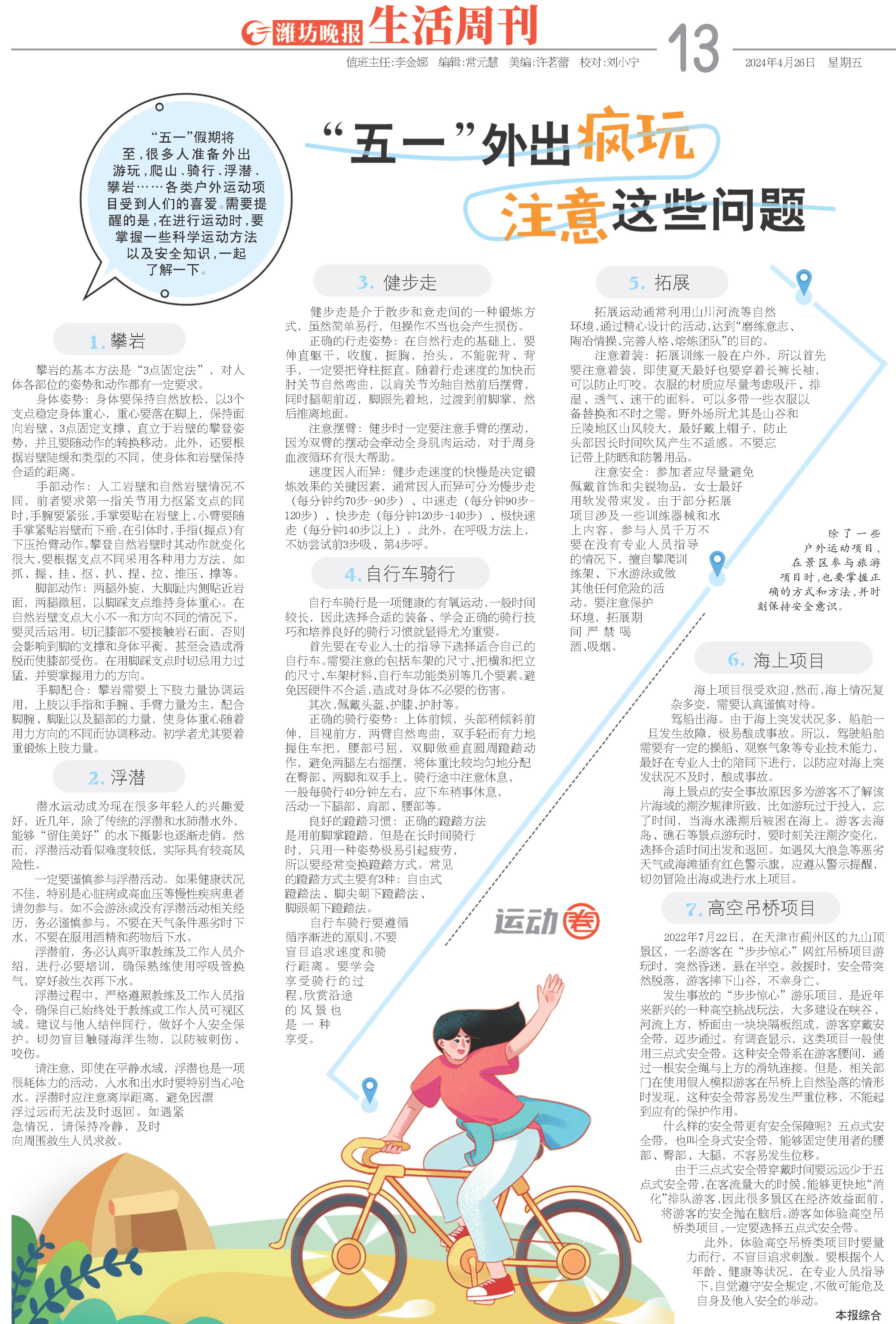 “五一”假期将至,很多人准备外出游玩,爬山、骑行、浮潜、攀岩……各类户外运动项目受到人们的喜爱。需要提醒的是,在进行运动时,要掌握一些科学运动方法以及安全知识,一起了解一下。