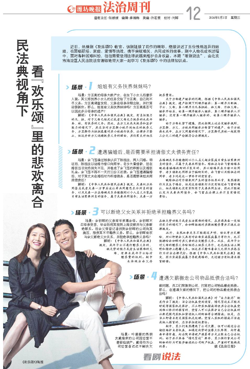 近日,热播剧《欢乐颂5》收官。该剧延续了前作的精彩,继续讲述了五位性格迥异的姑娘,在面临职场、家庭、爱情等挑战,携手突破难关,共同成长的故事。剧中人物在成长过程中,面对各种困难纠纷,往往需要使用法律武器来维护自身权益。本期“看剧说法”,由北京市海淀区人民法院法官谢银艳带大家一起学习《欢乐颂5》中的法律知识点。