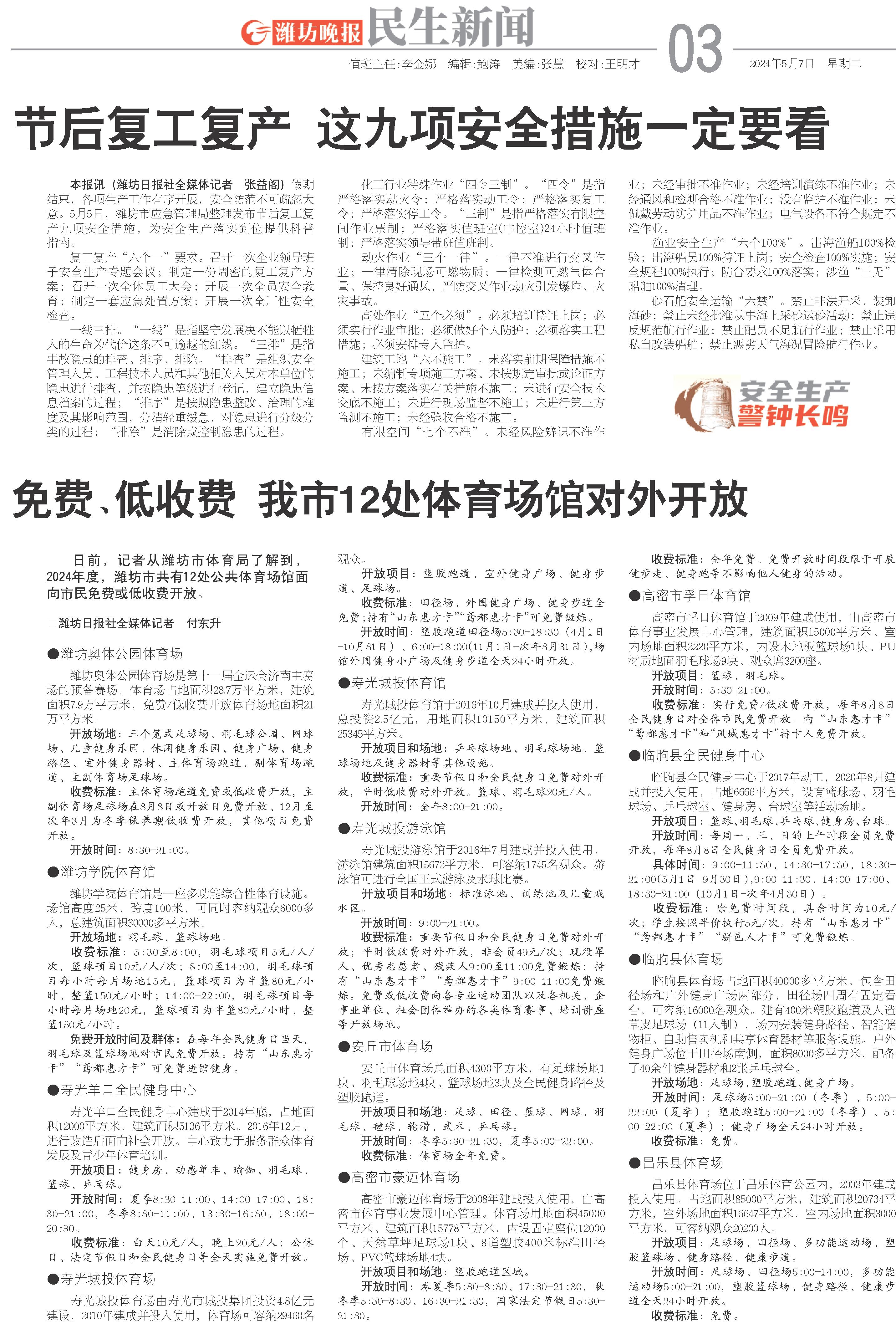 日前,记者从潍坊市体育局了解到,2024年度,潍坊市共有12处公共体育场馆面向市民免费或低收费开放。