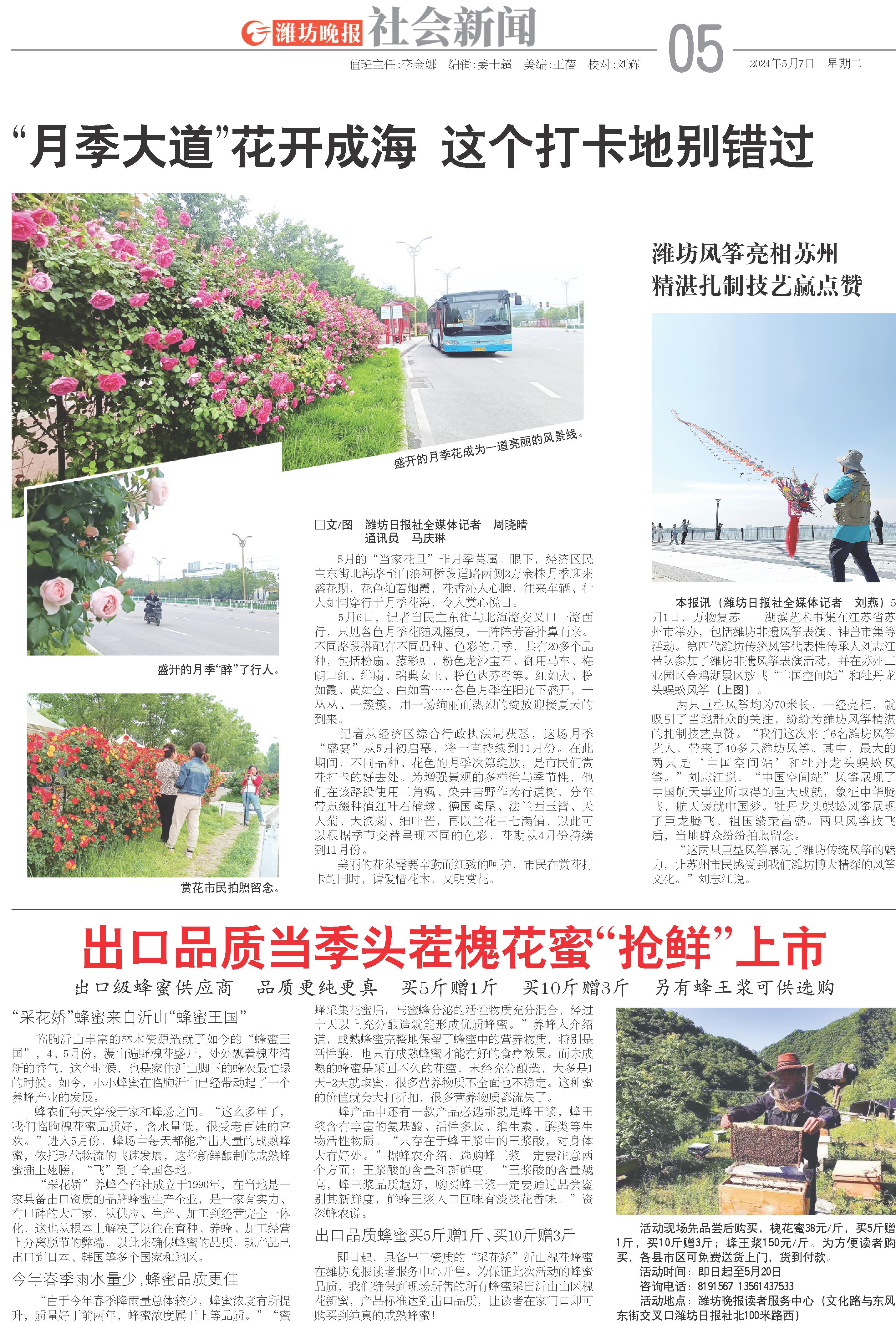 本报讯(潍坊日报社全媒体记者 刘燕)5月1日,万物复苏——湖滨艺术事集在江苏省苏州市举办,包括潍坊非遗风筝表演、神兽市集等活动。第四代潍坊传统风筝代表性传承人刘志江带队参加了潍坊非遗风筝表演活动,并在苏州工业园区金鸡湖景区放飞“中国空间站”和牡丹龙头蜈蚣风筝(上图)。