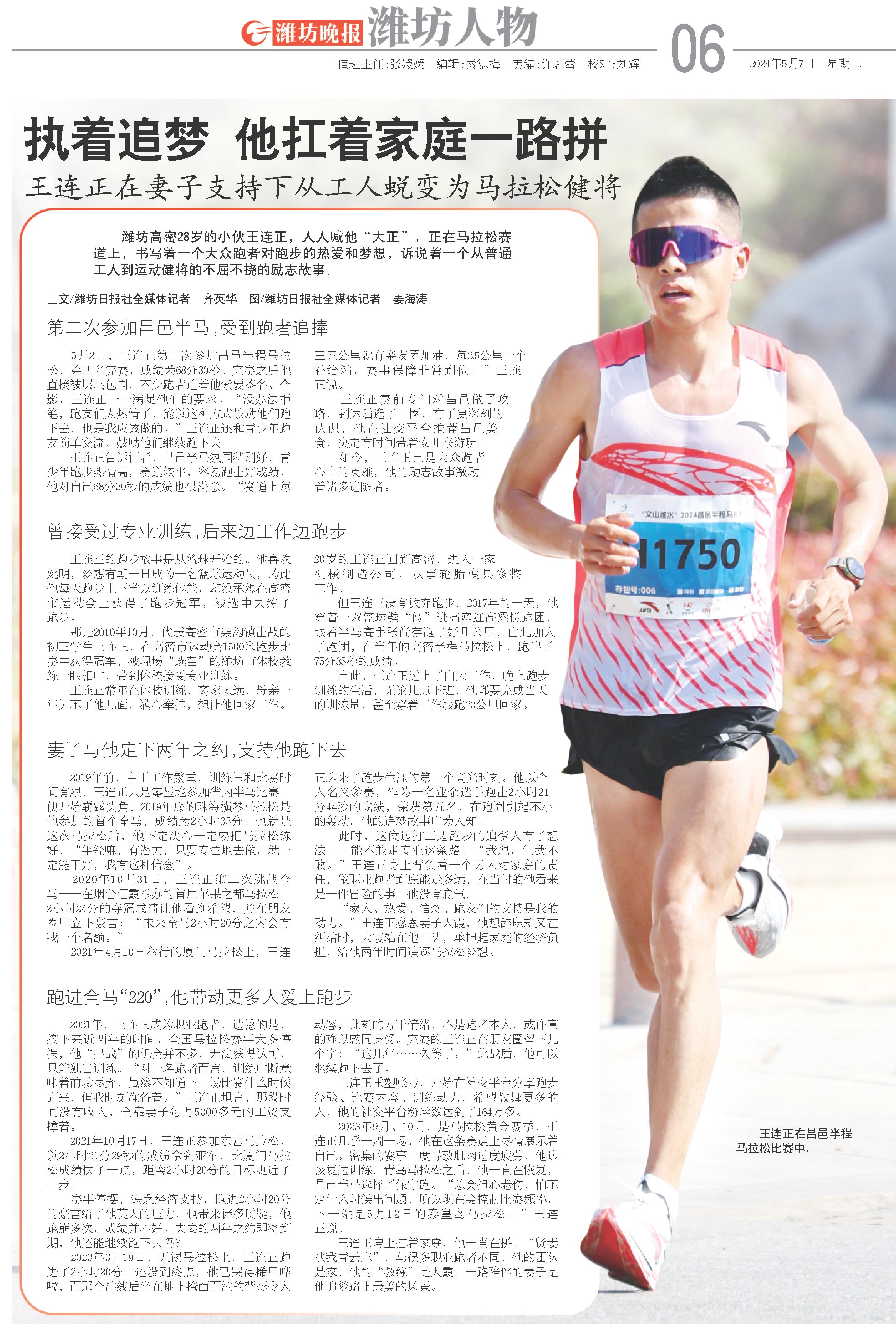 潍坊高密28岁的小伙王连正,人人喊他“大正”,正在马拉松赛道上,书写着一个大众跑者对跑步的热爱和梦想,诉说着一个从普通工人到运动健将的不屈不挠的励志故事。