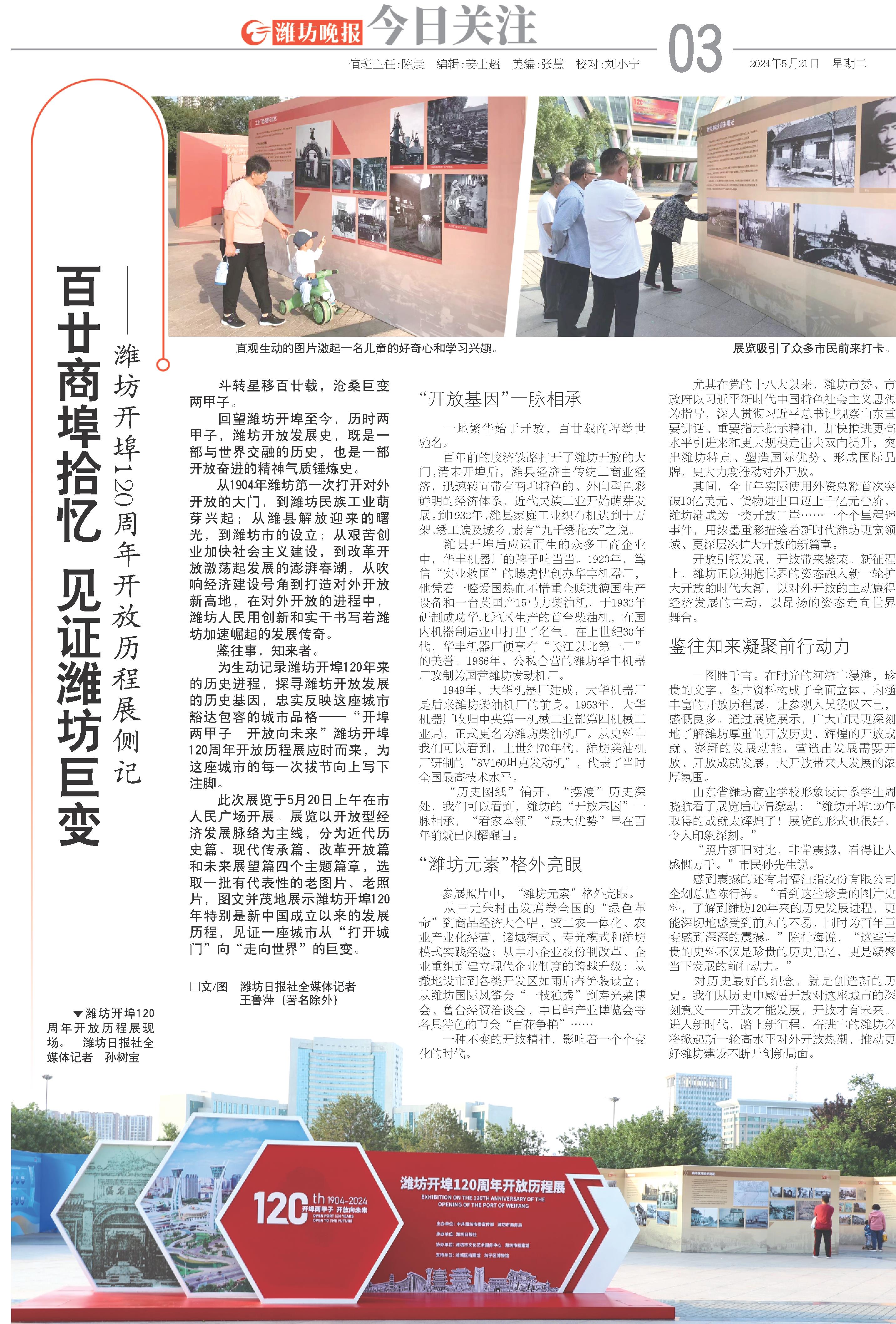 此次展览于5月20日上午在市人民广场开展。展览以开放型经济发展脉络为主线,分为近代历史篇、现代传承篇、改革开放篇和未来展望篇四个主题篇章,选取一批有代表性的老图片、老照片,图文并茂地展示潍坊开埠120年特别是新中国成立以来的发展历程,见证一座城市从“打开城门”向“走向世界”的巨变。