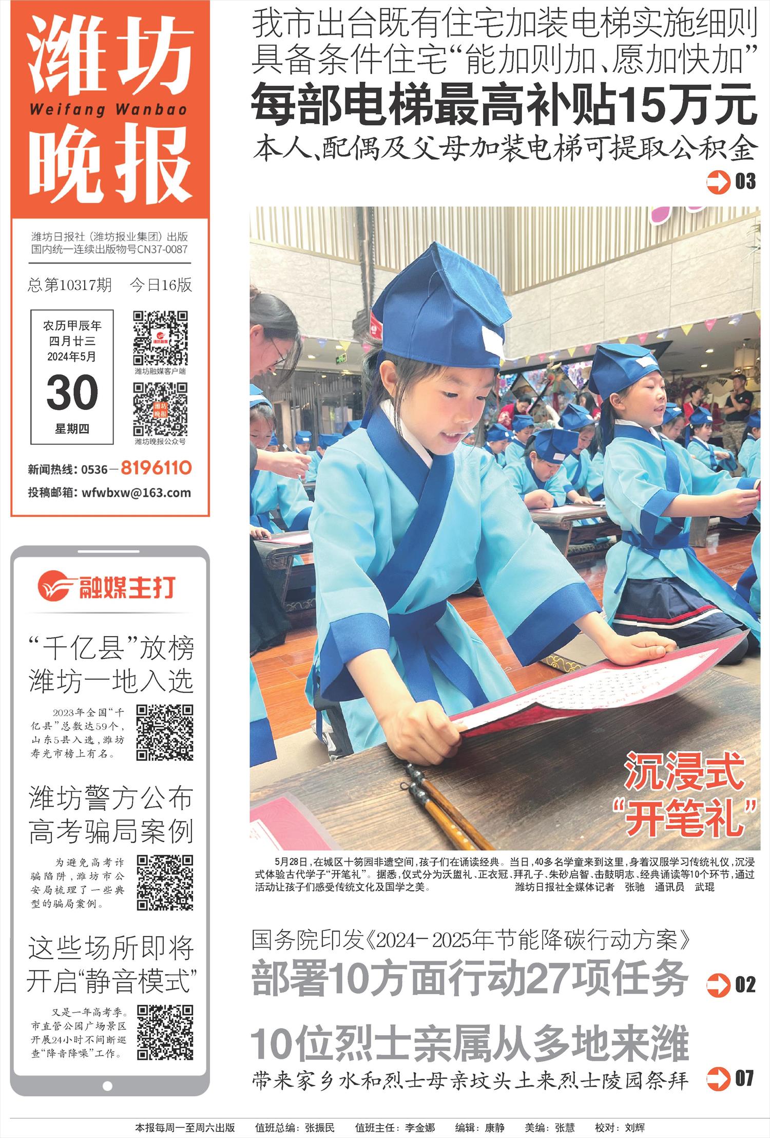 5月28日,在城区十笏园非遗空间,孩子们在诵读经典。当日,40多名学童来到这里,身着汉服学习传统礼仪,沉浸式体验古代学子“开笔礼”。据悉,仪式分为沃盥礼、正衣冠、拜孔子、朱砂启智、击鼓明志、经典诵读等10个环节,通过活动让孩子们感受传统文化及国学之美。 潍坊日报社全媒体记者 张驰 通讯员 武琨