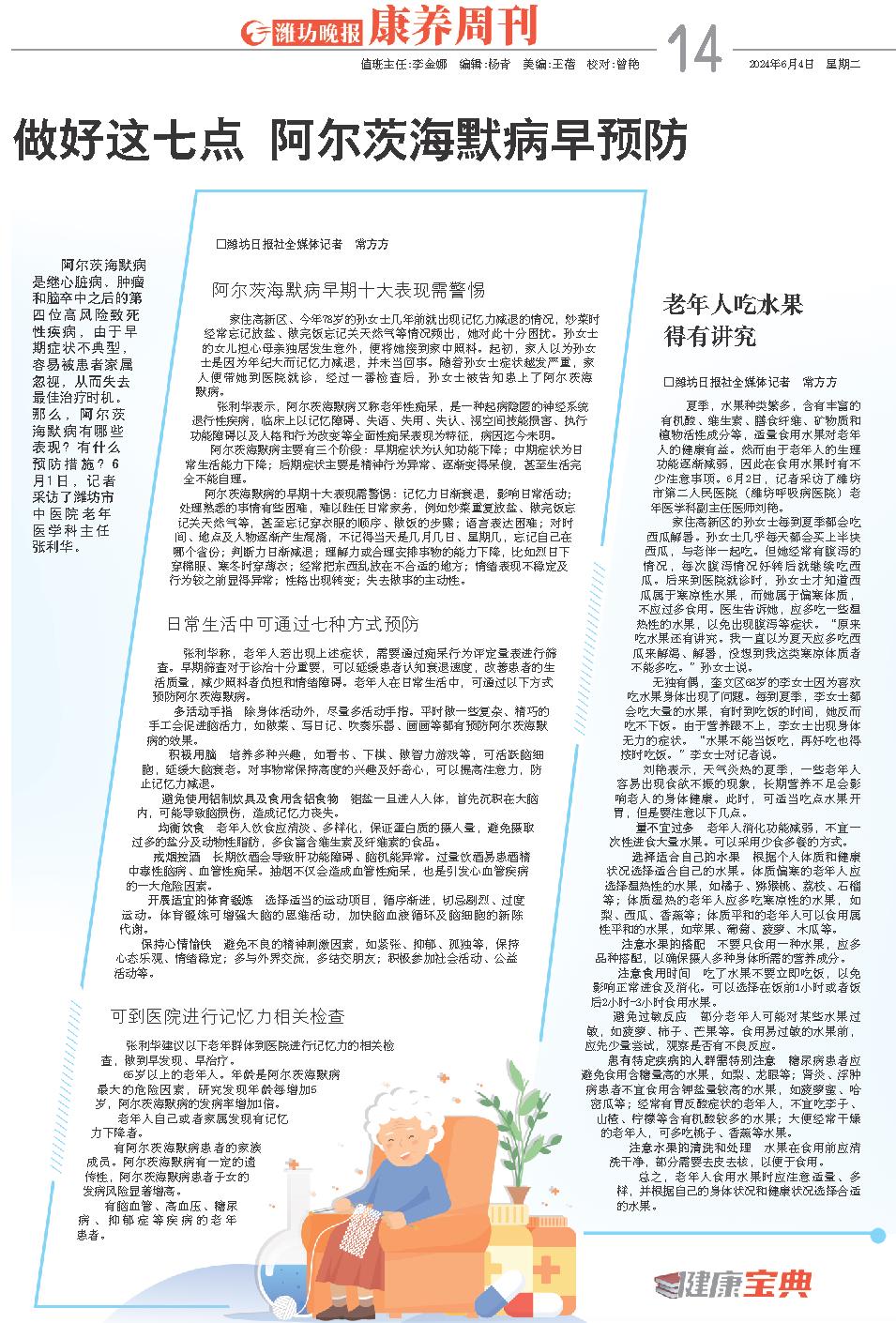 阿尔茨海默病是继心脏病、肿瘤和脑卒中之后的第四位高风险致死性疾病,由于早期症状不典型,容易被患者家属忽视,从而失去最佳治疗时机。那么,阿尔茨海默病有哪些表现?有什么预防措施?6月1日,记者采访了潍坊市中医院老年医学科主任张利华。