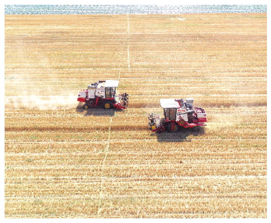 6月17日,在山东潍坊高密市咸家社区,大型农机在田间收割小麦(无人机照片)。眼下正是“三夏”农忙时节,各地农民抢抓农时,开展夏收、夏种、夏管等农事活动,田间地头呈现一派繁忙景象。 新华社发