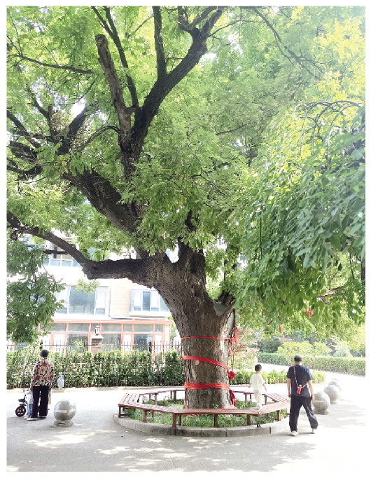 这棵国槐不仅是小区内一道美丽的风景,更是社区居民共同的记忆与骄傲。它像一位老友,陪伴着一代又一代居民,不少居民从小时候就在这棵树下玩耍。该树树干笔直而粗壮,胸围达3.8米,高度约12.8米,平均冠幅为19米。它的枝叶浓密,仿佛一把巨大的绿色遮阳伞,为小区居民提供了清凉的避暑之地(左图)。