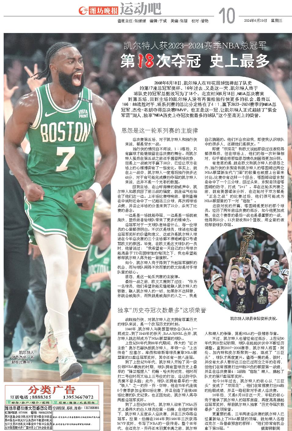 16年后,又是6月18日这一天,年轻的核心终于继承了凯尔特人的冠军底蕴,再度高高捧起总冠军奖杯,帮助凯尔特人独享“历史夺冠次数最多”这项荣誉。