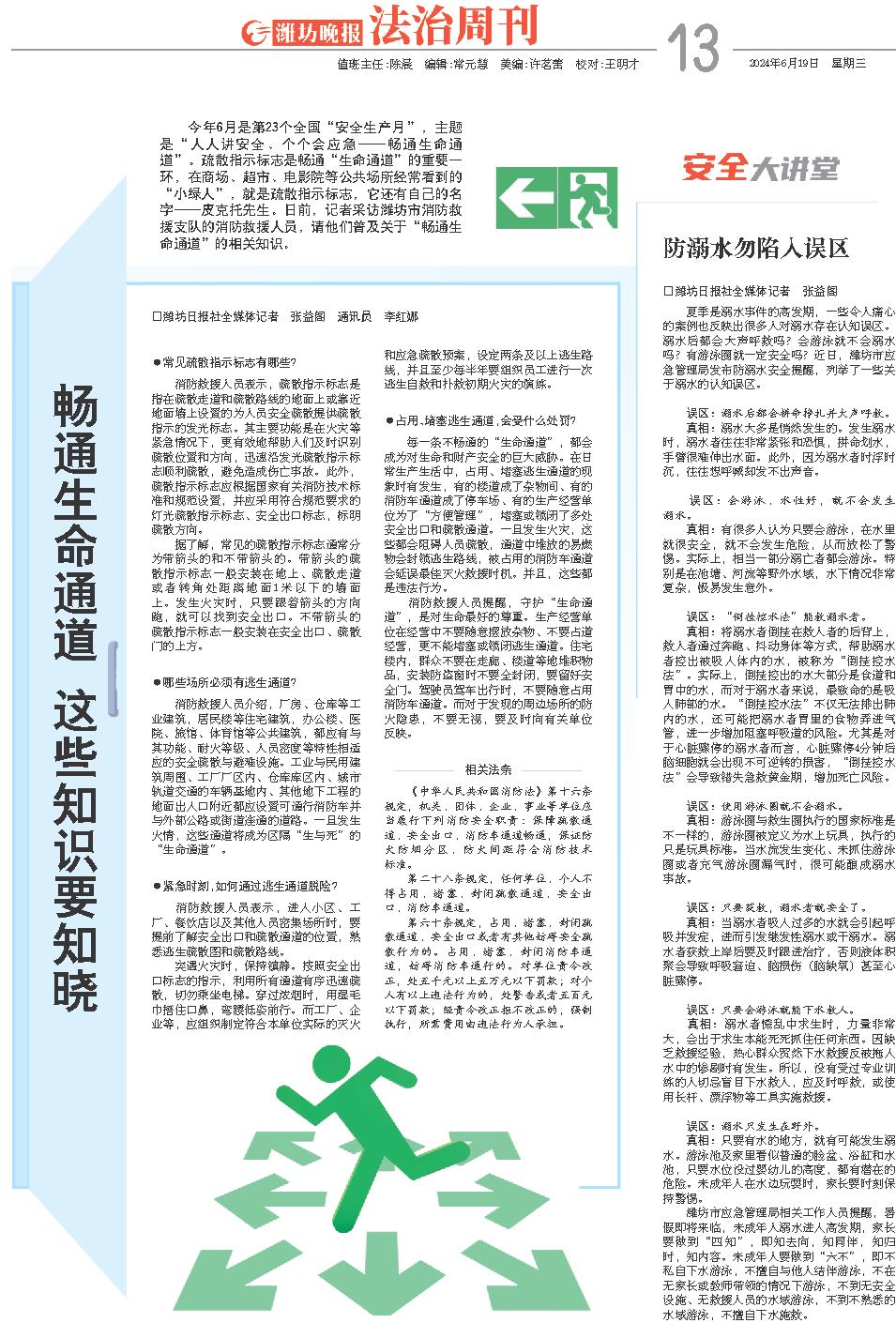 今年6月是第23个全国“安全生产月”,主题是“人人讲安全、个个会应急——畅通生命通道”。疏散指示标志是畅通“生命通道”的重要一环,在商场、超市、电影院等公共场所经常看到的“小绿人”,就是疏散指示标志,它还有自己的名字——皮克托先生。日前,记者采访潍坊市消防救援支队的消防救援人员,请他们普及关于“畅通生命通道”的相关知识。