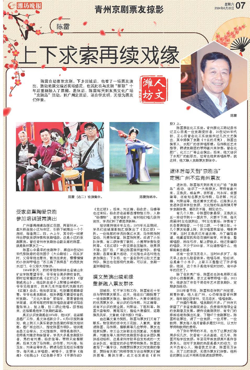 陈雷自幼喜欢京剧。下乡回城后,他看了一场票友演出,激动地撰文描述现场盛况,也因此在与京剧“断联”十年后重新融入了票圈。退休后,陈雷每天到东夷文化广场“京剧岛”活动。到广州定居后,还自学京胡,无偿为票友们伴奏。