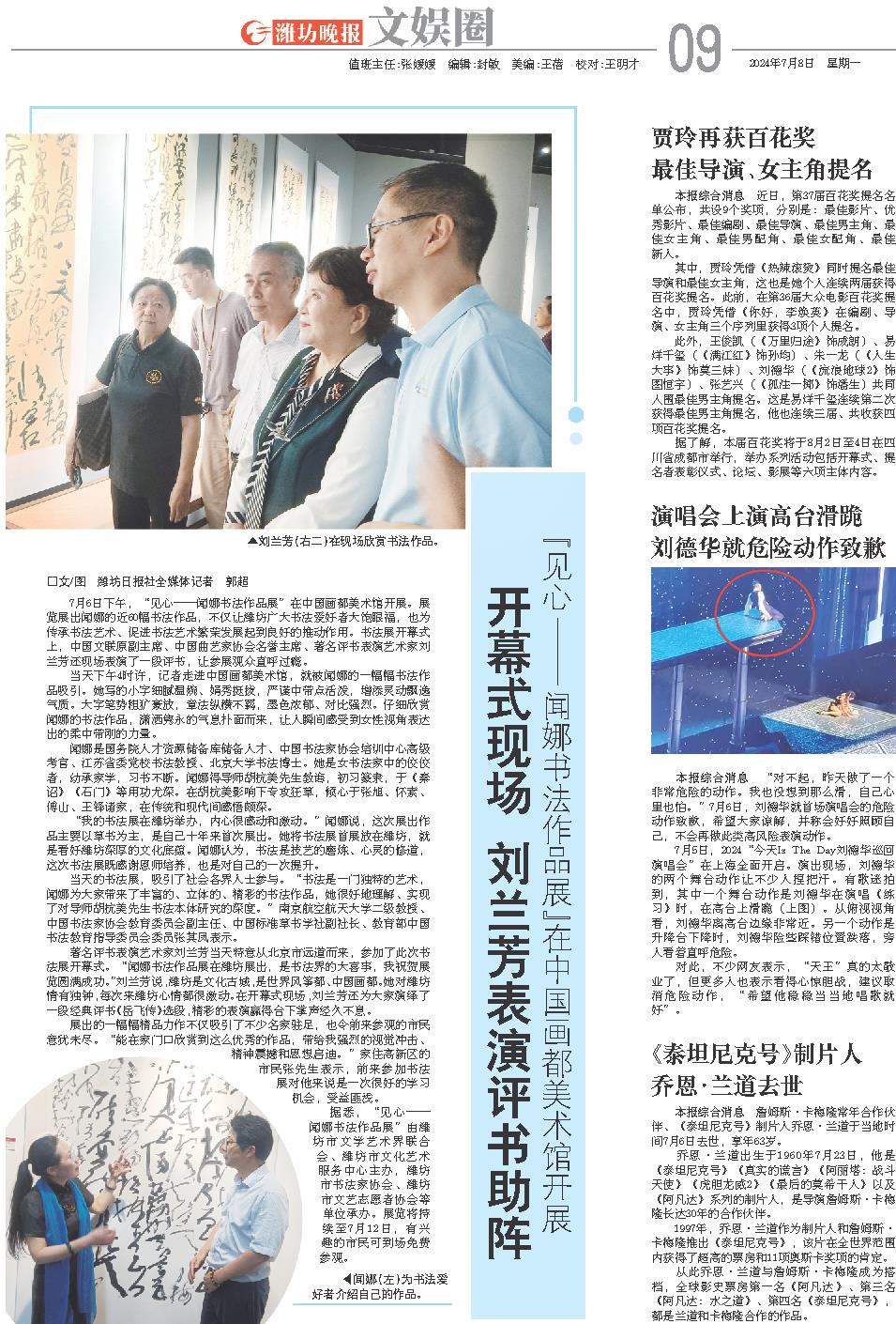 7月6日下午,“见心——闻娜书法作品展”在中国画都美术馆开展。展览展出闻娜的近60幅书法作品,不仅让潍坊广大书法爱好者大饱眼福,也为传承书法艺术、促进书法艺术繁荣发展起到良好的推动作用。书法展开幕式上,中国文联原副主席、中国曲艺家协会名誉主席、著名评书表演艺术家刘兰芳还现场表演了一段评书,让参展观众直呼过瘾。