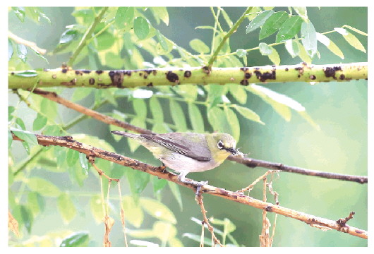 本报讯(潍坊日报社全媒体记者 巩建国)雨后的河畔湿润,潍坊白浪河景区内视野开阔、林木茂盛,是林鸟们喜欢光顾的地方。一根结满了槐米的槐树枝,突然抖动了一下,一只青绿色的小鸟探出头来,在树梢上来回跳跃,捕食着各种小虫,这就是美丽可爱的暗绿绣眼鸟(上图)。