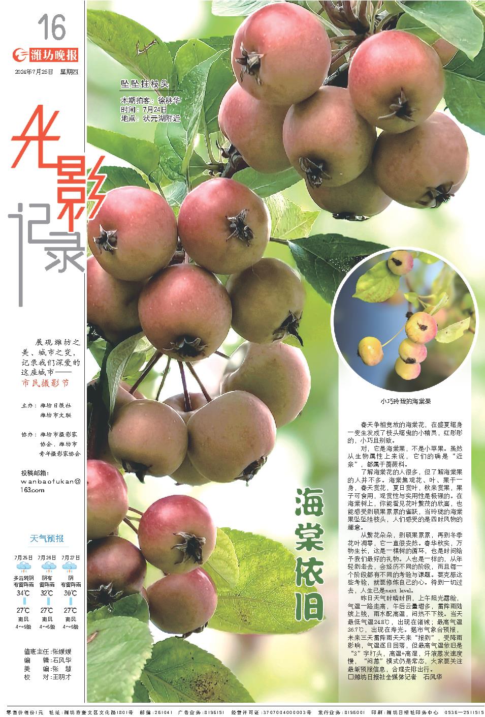 了解海棠花的人很多,但了解海棠果的人并不多。海棠集观花、叶、果于一身,春天赏花,夏日赏叶,秋来赏果,果子可食用,观赏性与实用性是极强的。在海棠树上,你能看见花叶繁茂的欣喜,也能感受到硕果累累的雀跃,当玲珑的海棠果坠坠挂枝头,人们感受的是四时风物的趣意。