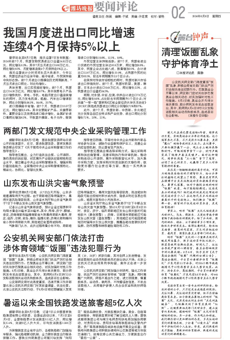 新华社北京8月7日电 海关总署7日发布数据:2024年前7个月,我国货物贸易进出口总值24.83万亿元,同比增长6.2%。其中7月当月进出口3.68万亿元,同比增长6.5%,月度增速连续4个月保持在5%以上。