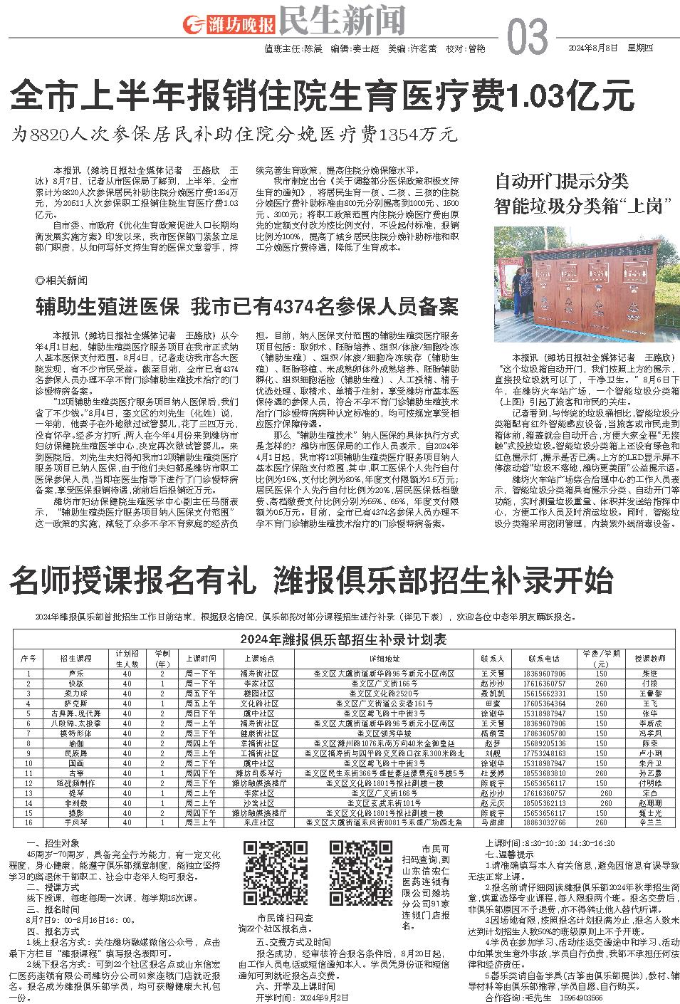 2024年潍报俱乐部首批招生工作日前结束,根据报名情况,俱乐部拟对部分课程招生进行补录(详见下表),欢迎各位中老年朋友踊跃报名。