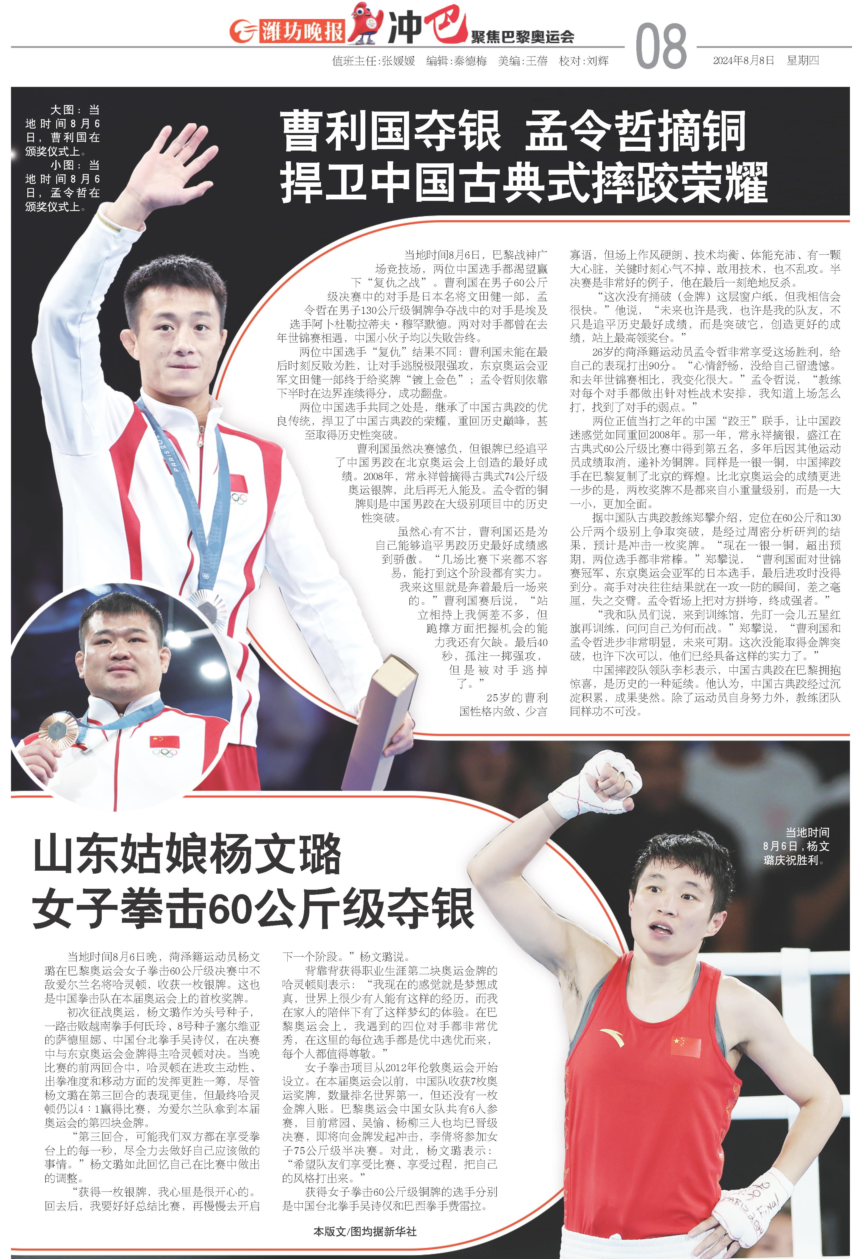 当地时间8月6日晚,菏泽籍运动员杨文璐在巴黎奥运会女子拳击60公斤级决赛中不敌爱尔兰名将哈灵顿,收获一枚银牌。这也是中国拳击队在本届奥运会上的首枚奖牌。