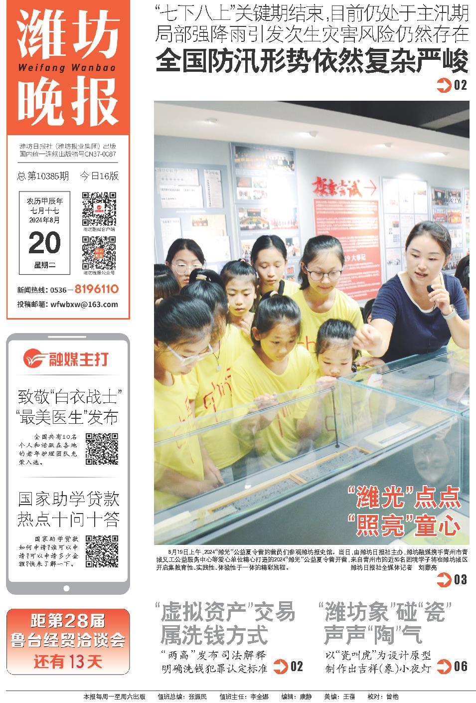 8月19日上午,2024“潍光”公益夏令营的营员们参观潍坊报史馆。当日,由潍坊日报社主办,潍坊融媒携手青州市青城义工公益服务中心等爱心单位精心打造的2024“潍光”公益夏令营开营,来自青州市的近50名困境学子将在潍坊城区开启集教育性、实践性、体验性于一体的精彩旅程。 潍坊日报社全媒体记者 刘蒙亮