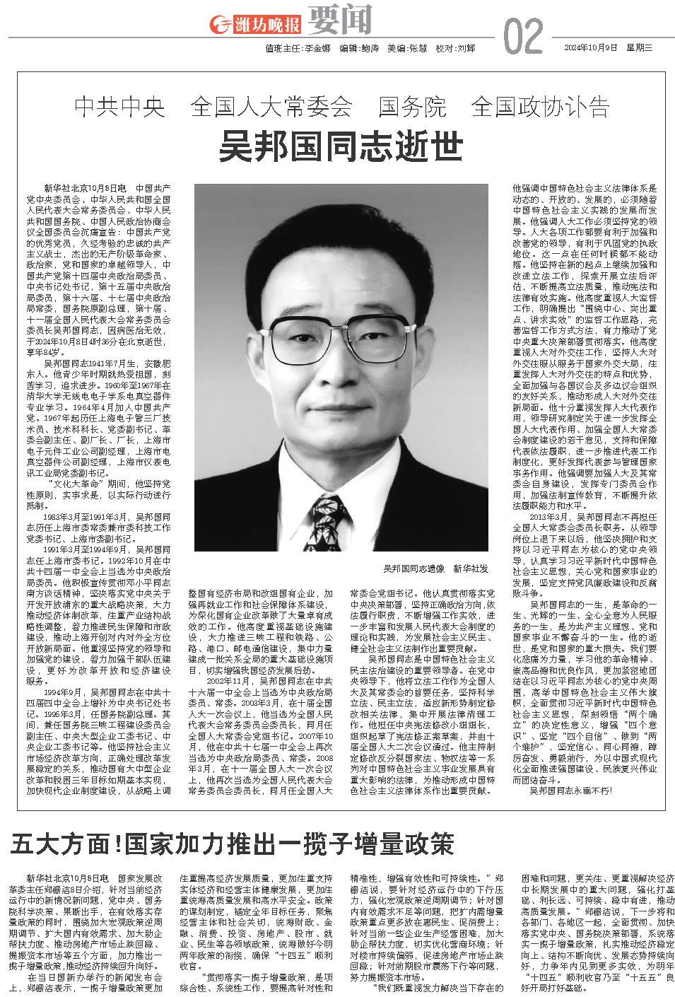 新华社北京10月8日电 中国共产党中央委员会、中华人民共和国全国人民代表大会常务委员会、中华人民共和国国务院、中国人民政治协商会议全国委员会沉痛宣告:中国共产党的优秀党员,久经考验的忠诚的共产主义战士,杰出的无产阶级革命家、政治家,党和国家的卓越领导人,中国共产党第十四届中央政治局委员、中央书记处书记,第十五届中央政治局委员,第十六届、十七届中央政治局常委,国务院原副总理,第十届、十一届全国人民代表大会常务委员会委员长吴邦国同志,因病医治无效,于2024年10月8日4时36分在北京逝世,享年84岁。