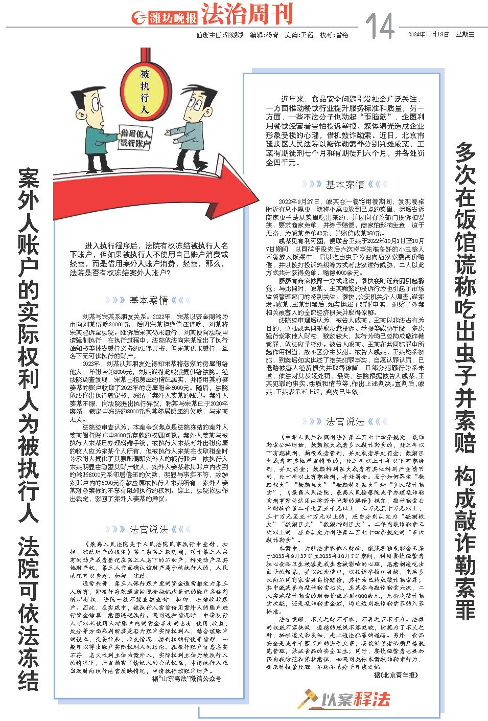 戚某见有利可图,便联合王某于2022年10月1日至10月7日期间,以同样手段先后六次将事先准备好的小虫趁人不备放入饭菜中,后以吃出虫子为由向店家索要高价赔偿,并以拨打投诉热线等方式对店家进行威胁,二人以此方式共计获得免单、赔偿4000余元。