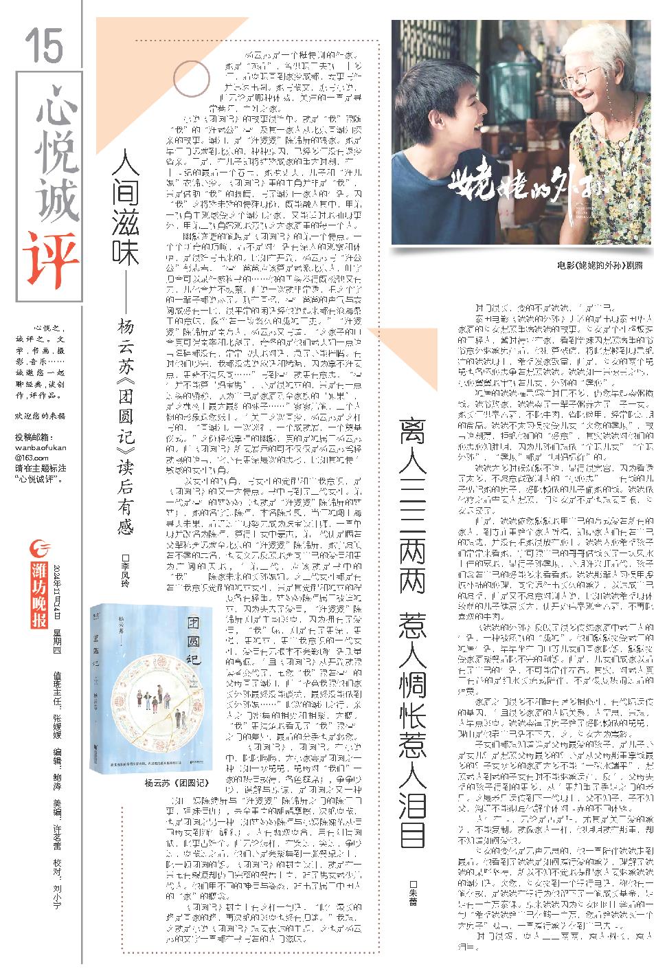《团圆记》封面上有这样一句话:“此生漫长的路是回家的路,再决绝的逃离也终有归途。”我想,这就是小说《团圆记》想要表达的主题,这也是杨云苏的文字一直都在书写着的人间滋味。