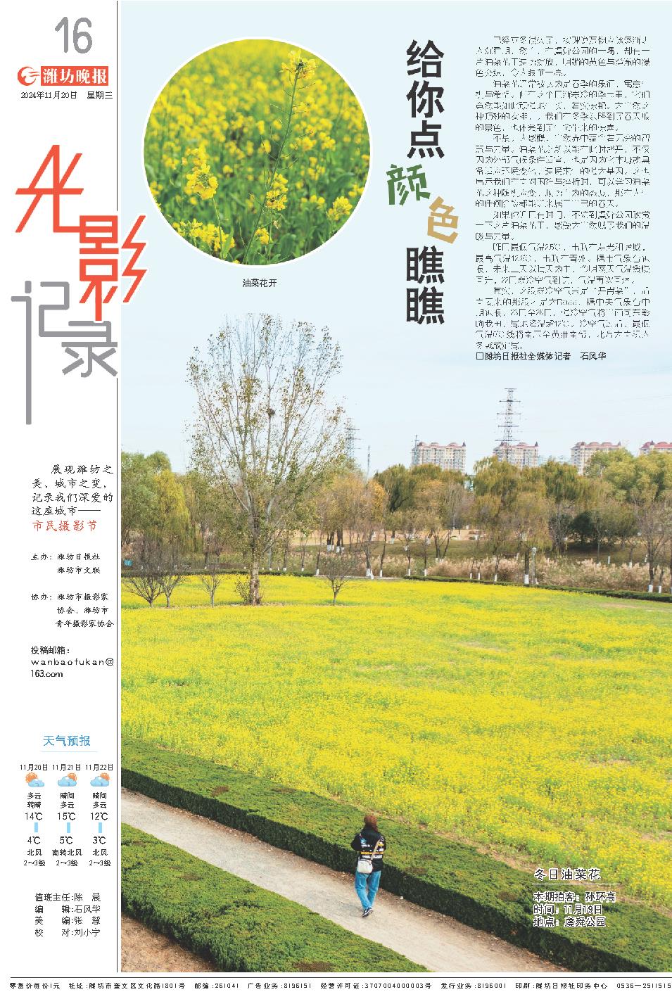 已经立冬很久了,按理说万物应该逐渐进入沉睡期,然而,在虞舜公园的一隅,却有一片油菜花田逆势绽放,明媚的黄色与澄澈的绿色交织,令人眼前一亮。