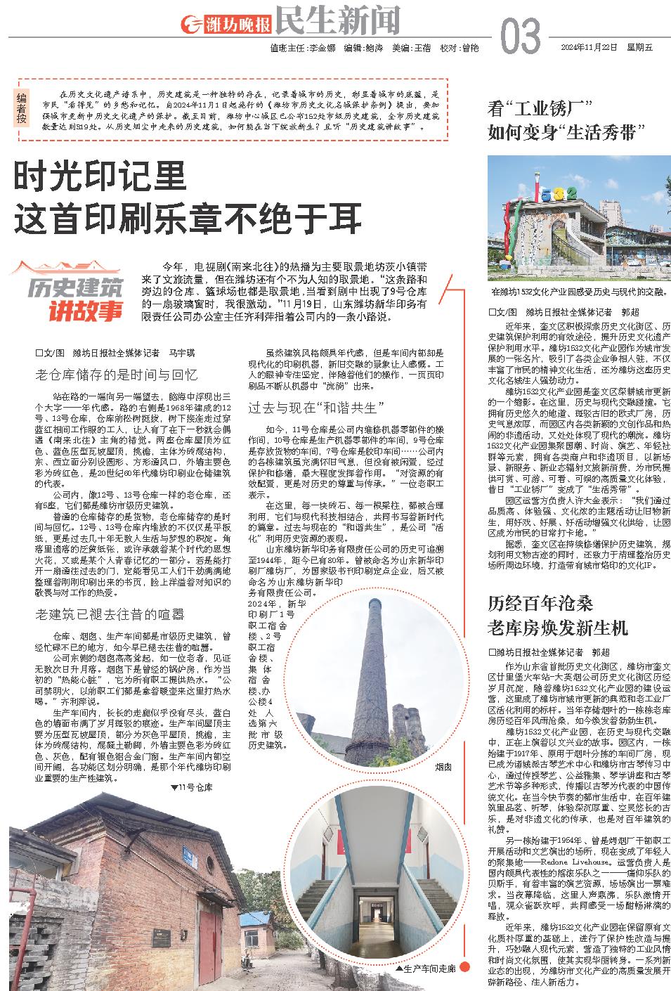 今年,电视剧《南来北往》的热播为主要取景地坊茨小镇带来了文旅流量,但在潍坊还有个不为人知的取景地。“这条路和旁边的仓库、篮球场也都是取景地,当看到剧中出现了9号仓库的一扇玻璃窗时,我很激动。”11月19日,山东潍坊新华印务有限责任公司办公室主任齐利萍指着公司内的一条小路说。
