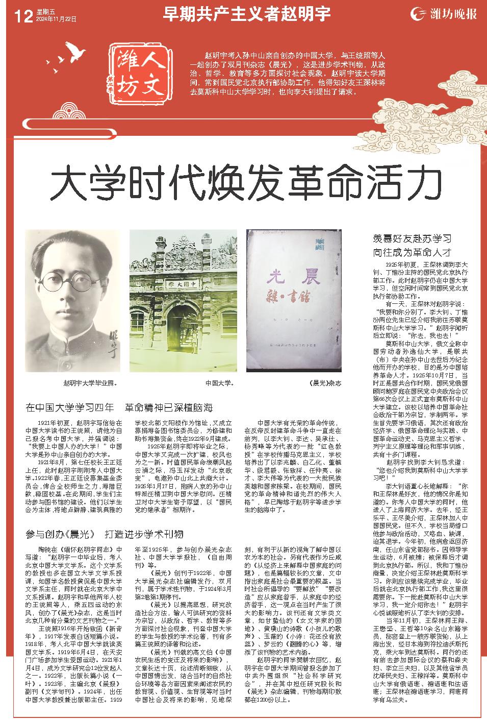赵明宇考入孙中山亲自创办的中国大学,与王统照等人一起创办了双月刊杂志《晨光》,这是进步学术刊物,从政治、哲学、教育等多方面探讨社会现象。赵明宇读大学期间,常到国民党北京执行部协助工作,他得知好友王深林将去莫斯科中山大学学习时,也向李大钊提出了请求。