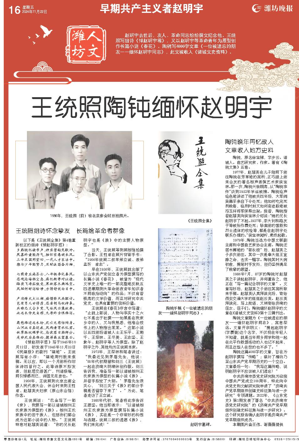 陶钝这篇4000字的文章,旨在为赵明宇撰写“传略”;填补了潍坊乃至山东共产党早期历史的一个空白。文章最后一句:“我写这篇传略,说明赵明宇不应该被人们遗忘!”