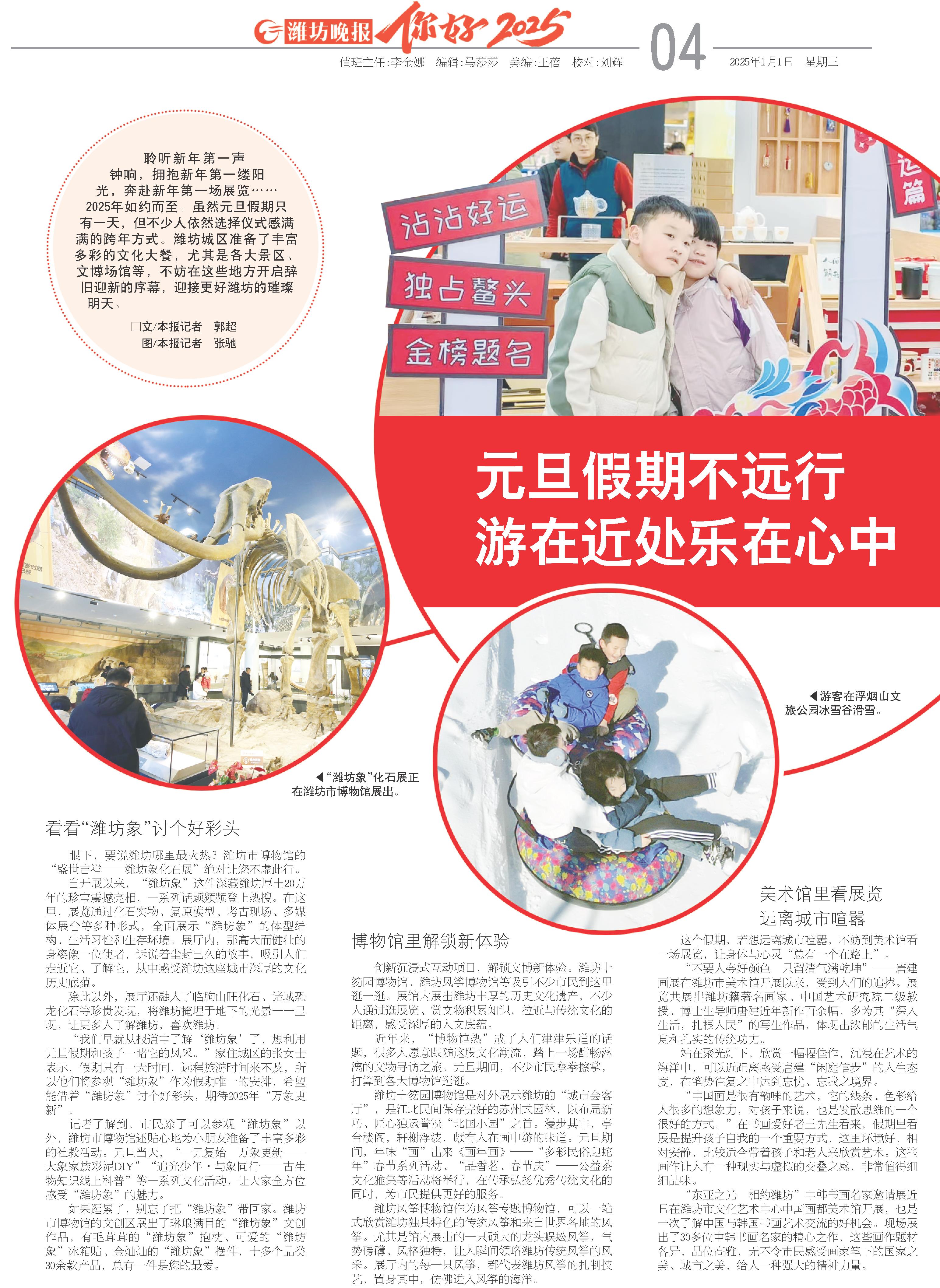 聆听新年第一声钟响,拥抱新年第一缕阳光,奔赴新年第一场展览……2025年如约而至。虽然元旦假期只有一天,但不少人依然选择仪式感满满的跨年方式。潍坊城区准备了丰富多彩的文化大餐,尤其是各大景区、文博场馆等,不妨在这些地方开启辞旧迎新的序幕,迎接更好潍坊的璀璨明天。