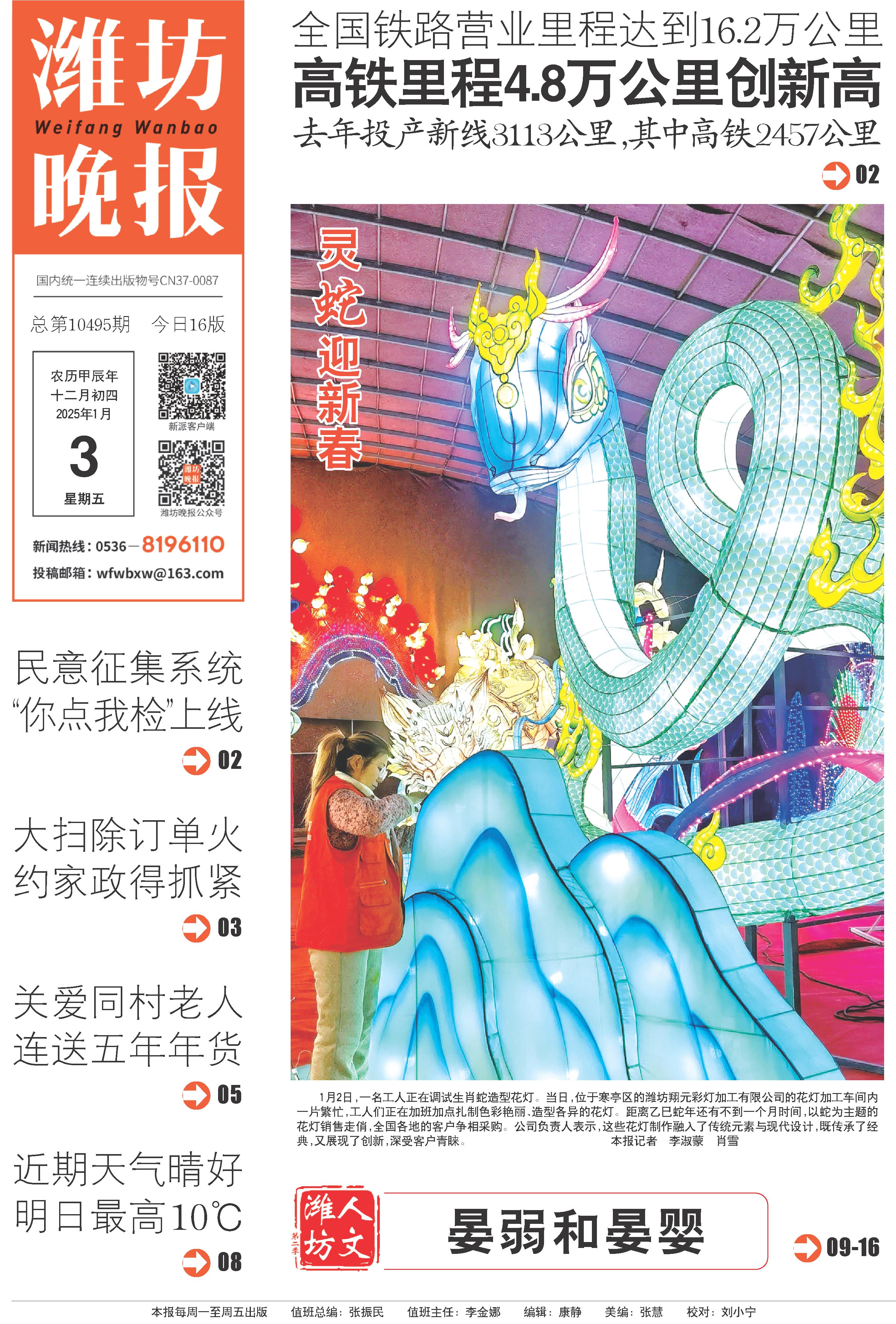 1月2日,一名工人正在调试生肖蛇造型花灯。当日,位于寒亭区的潍坊翔元彩灯加工有限公司的花灯加工车间内一片繁忙,工人们正在加班加点扎制色彩艳丽、造型各异的花灯。距离乙巳蛇年还有不到一个月时间,以蛇为主题的花灯销售走俏,全国各地的客户争相采购。公司负责人表示,这些花灯制作融入了传统元素与现代设计,既传承了经典,又展现了创新,深受客户青睐。 本报记者 李淑蒙 肖雪